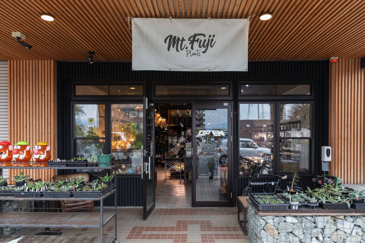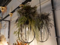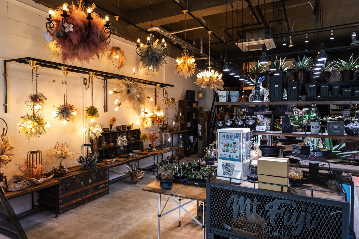 フラワーアーティストが手がけたドライフラワーをシャンデリアにあしらい、多肉植物を扱う「Mt.Fuji Plants」の一角を華やかに彩る。