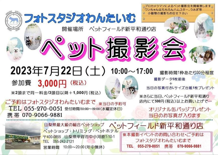 プロカメラマンが撮影してくれる 大好評のイベントです 犬 猫 は もっちろん 鳥 ウサギ 撮っちゃいますよぅ 撮影してる とこを 見るのもまた楽しいです😃 7/22今回は土曜... -