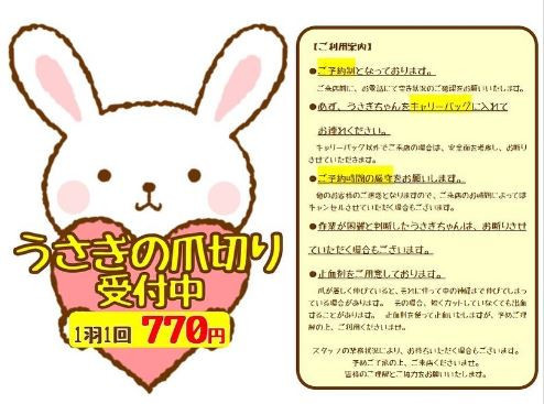○ご予約制となっております。 ○必ずうさぎちゃんをキャリーバッグに入れてお連れ下さい。 ○ご予約時間の厳守をお願いします。 ○作業が困難と判断したうさぎちゃんはお断りさせていただく場合も御座いま...