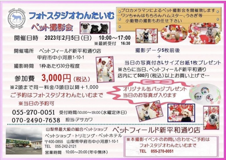 ペット撮影会のお知らせです ワンコ ニャンコ ハムスターやウサギちゃん 小動物や小鳥さんの撮影も☆ 大切な家族の記念にいかがですか (⁎⁍̴̛ᴗ⁍̴̛⁎) ペットフィールド新平和通り店...