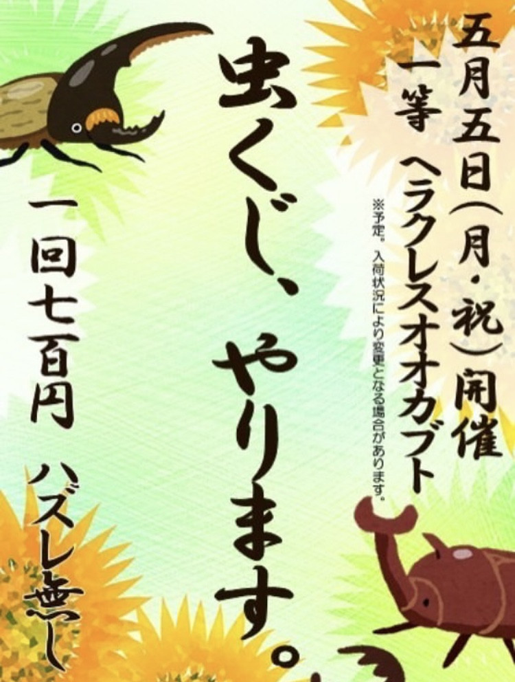 ペットフィールド新平和通り店です ゴールデンウィークイベントのお知らせ 5月5日は 虫くじです 虫くじの復活です🥹 1等は ヘラクレス なんと 今回の虫くじは1回 ... -