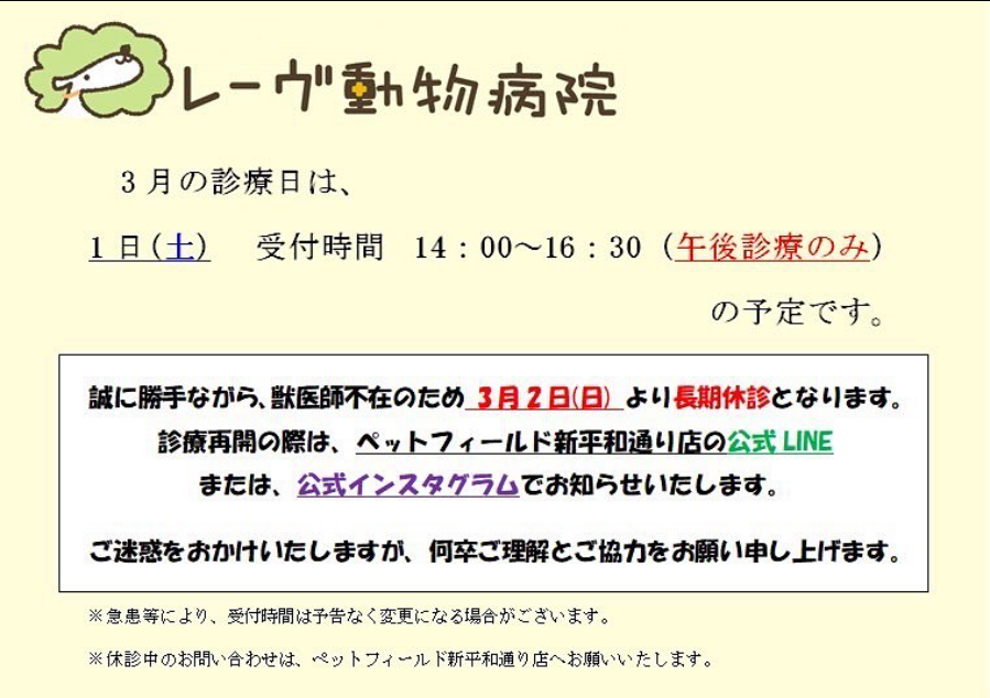 誠に勝手ながら 獣医師が 不在になる為 3月2日より 長期休診となります 再開院のお知らせは ペットフィールド新平和通り店の公式LINEまたは ペットフィールド新平和通り店インスタグラム...