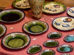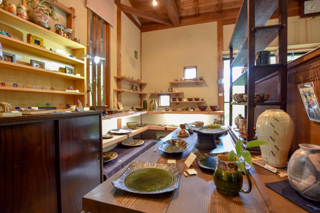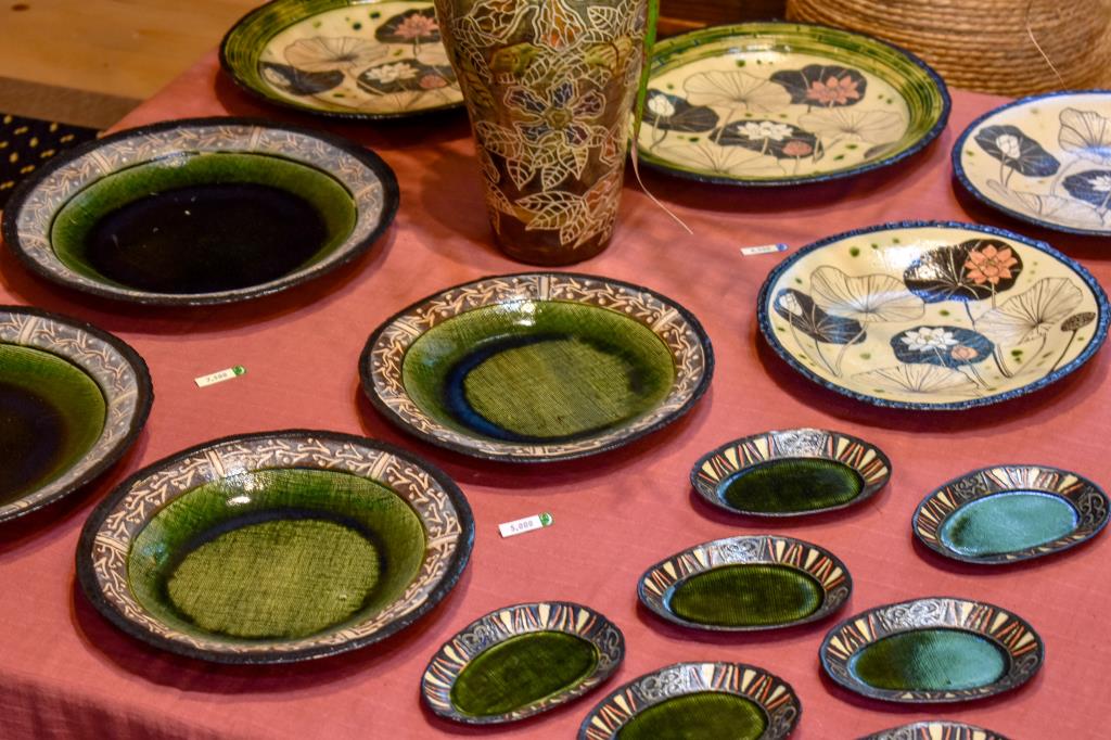 ご主人が手がける陶器は、様々な色の釉薬(ゆうやく)を使用した焼物がベース。色々な人が作ったかのようなバリエーションで、波打ちやたわみが陶器の自然な揺らぎを生み出している。