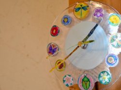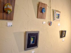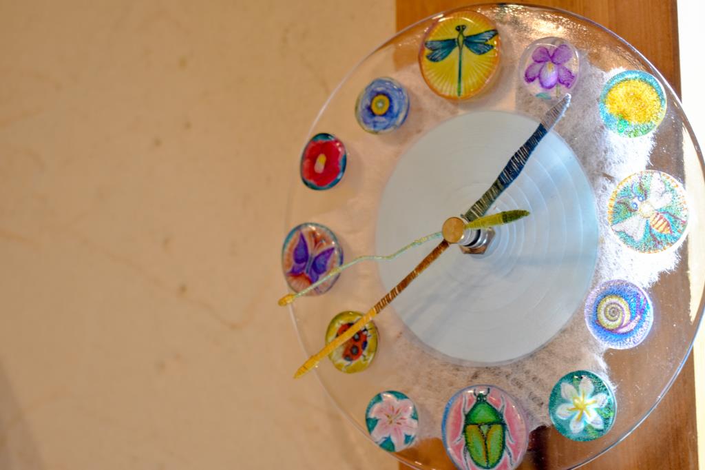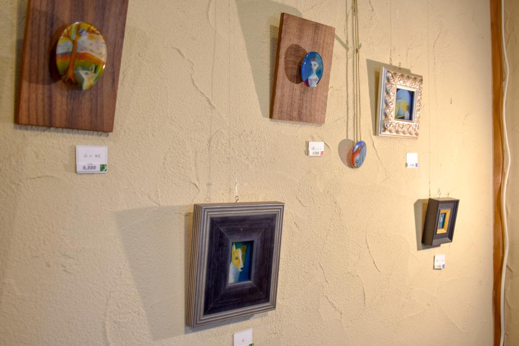 奥様が作るガラス細工は、サンドグラスに色鉛筆で絵を施したアクセサリーや小物が中心。色鉛筆だからこそ出せる色の重ね方や細かさが表現されている。
