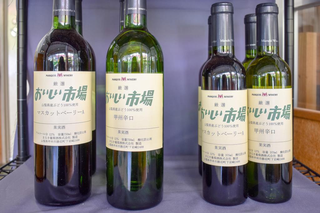 新鮮な旬野菜や果物はもちろん、県内外からリピーターが訪れる商品も!ジャムやジュース等、地元ならではの加工品も揃う。また、おいしい市場オリジナルのワインは、県産ぶどうを100%使用したすっきりと飲みやすい味わい。