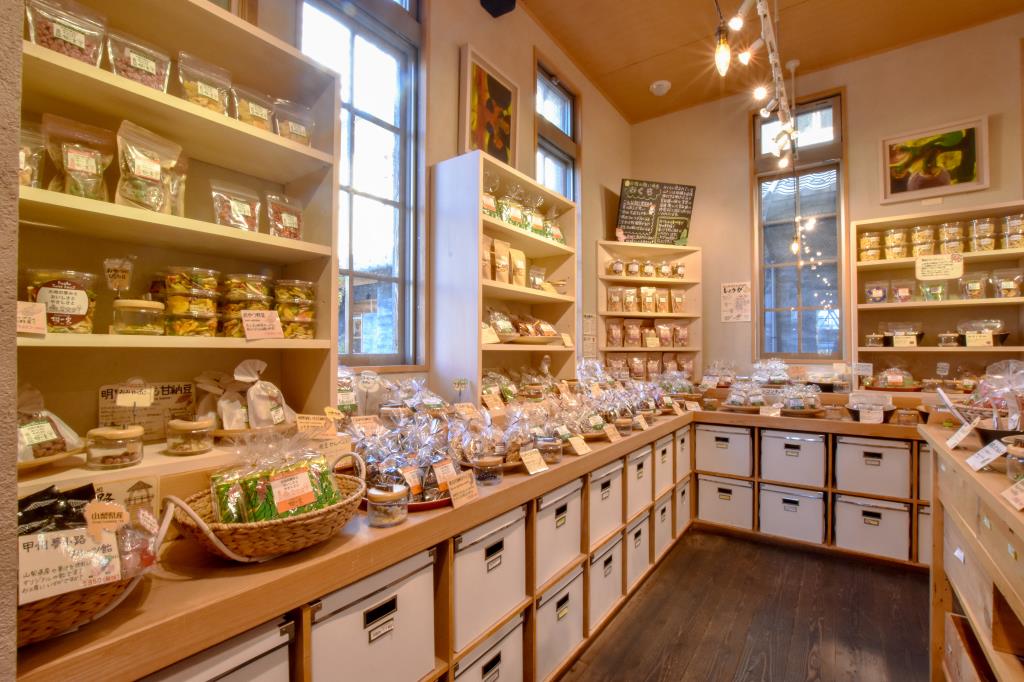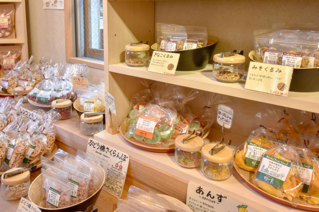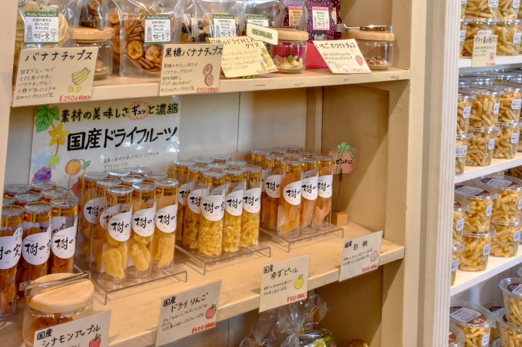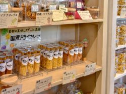 フルーツ王国山梨ならではのドライフルーツ専門店。ドライフルーツ以外にも、野菜のチップスなど約70種類もの商品が並んでいる!