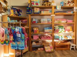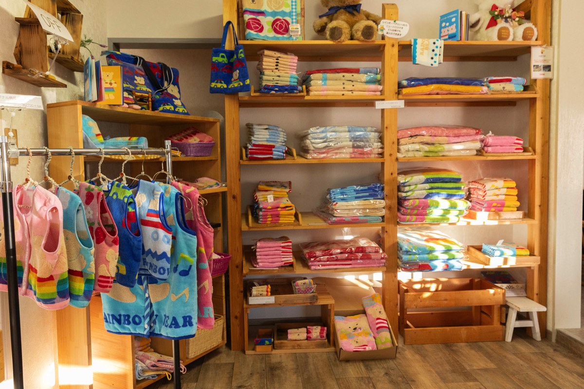 また結婚祝いや内祝い商品、カタログギフトなどのほか、オリジナルレインボーベアのスタイやママバッグも人気。店舗の一角には3坪ほどのカフェ「Remerci」を併設し、コーヒーと手作りスイーツを楽しめる。