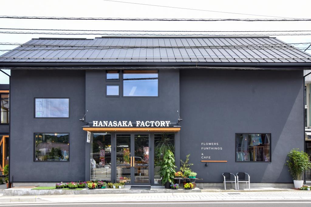 濃いグレーの外観に、店内は木の温もりを感じられる花と雑貨がいっぱいの色鮮やかな空間。