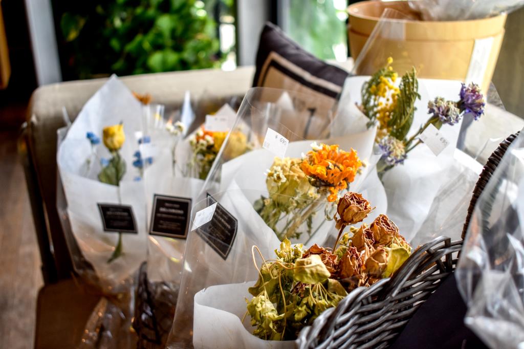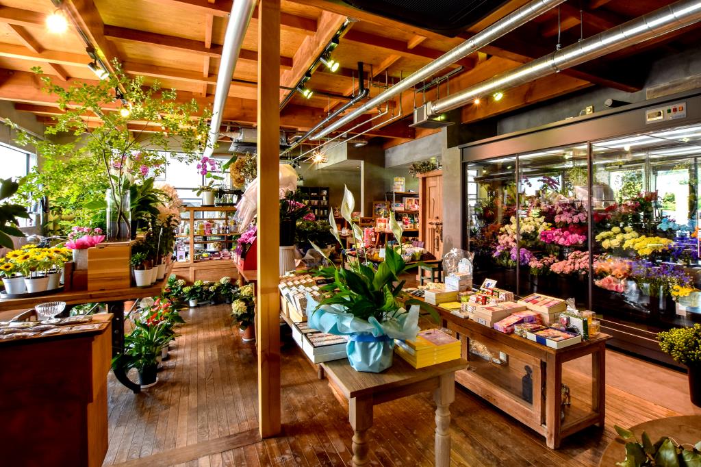 お花はフラワーギフトからアレンジメントまで幅広く対応していて一人一人の要望をかたちにしてくれる。隣にはカフェも併設。