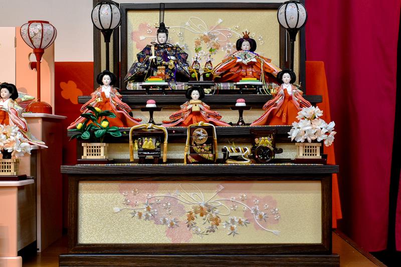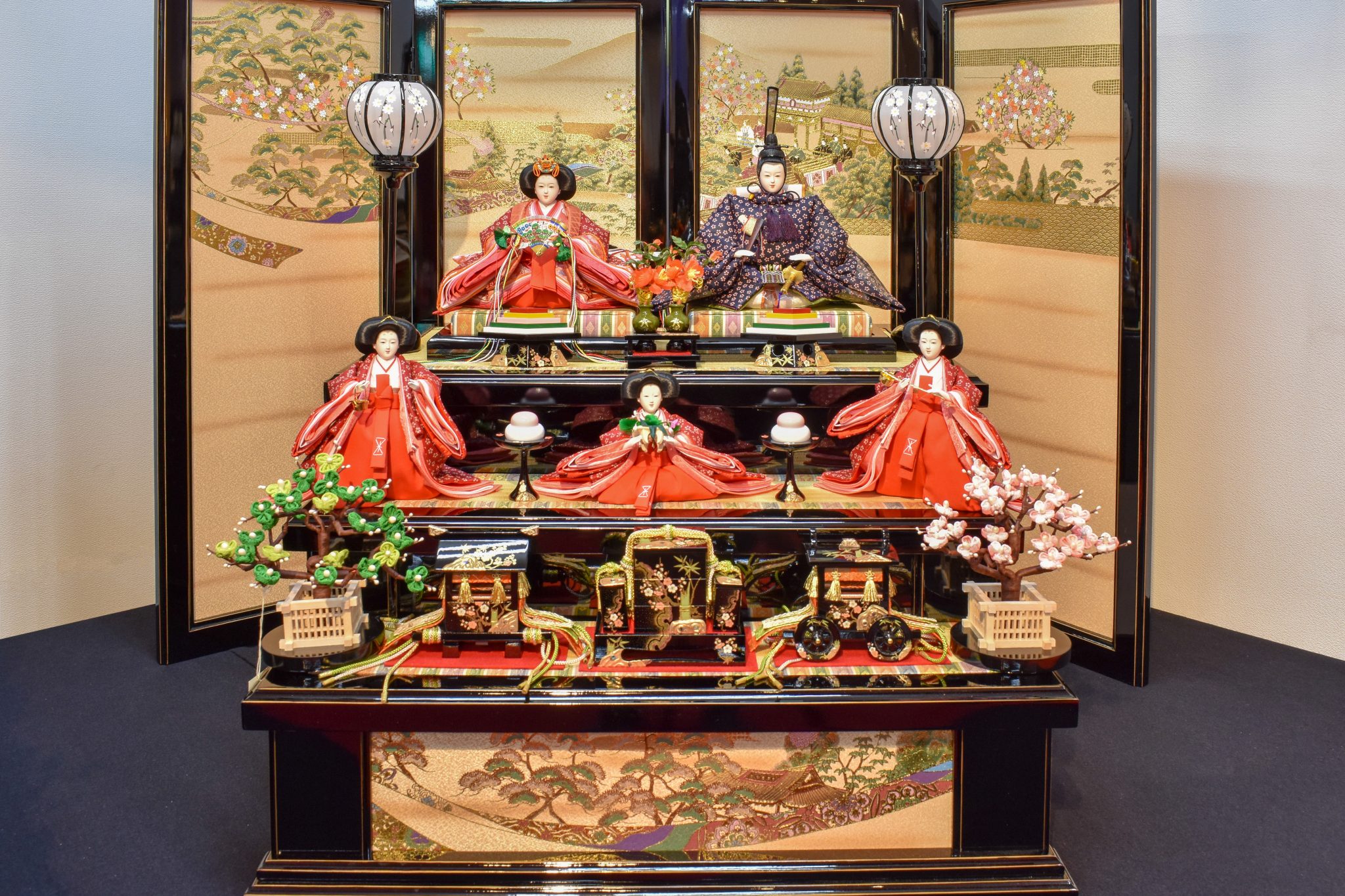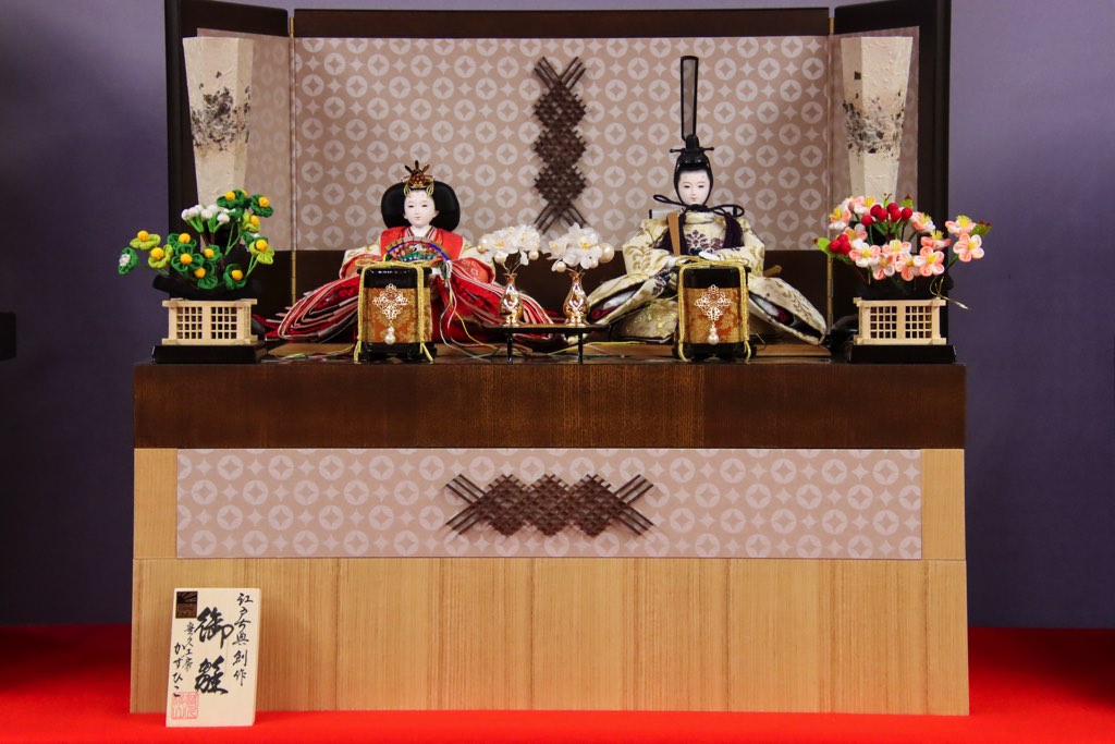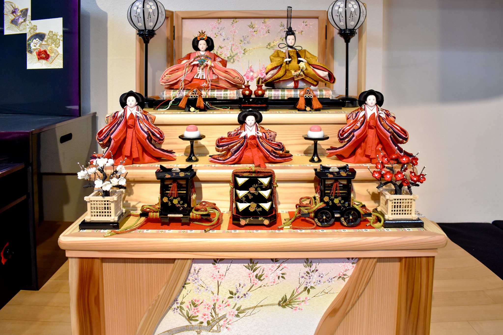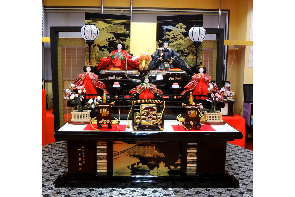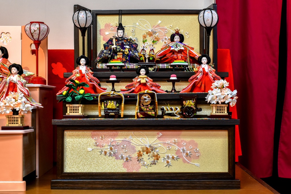 お客様により喜んでいただくために、平飾りや段飾りなど種類豊富に表情豊かな雛人形、兜飾や着用兜など用途に合わせ数多くの五月人形が展示される。