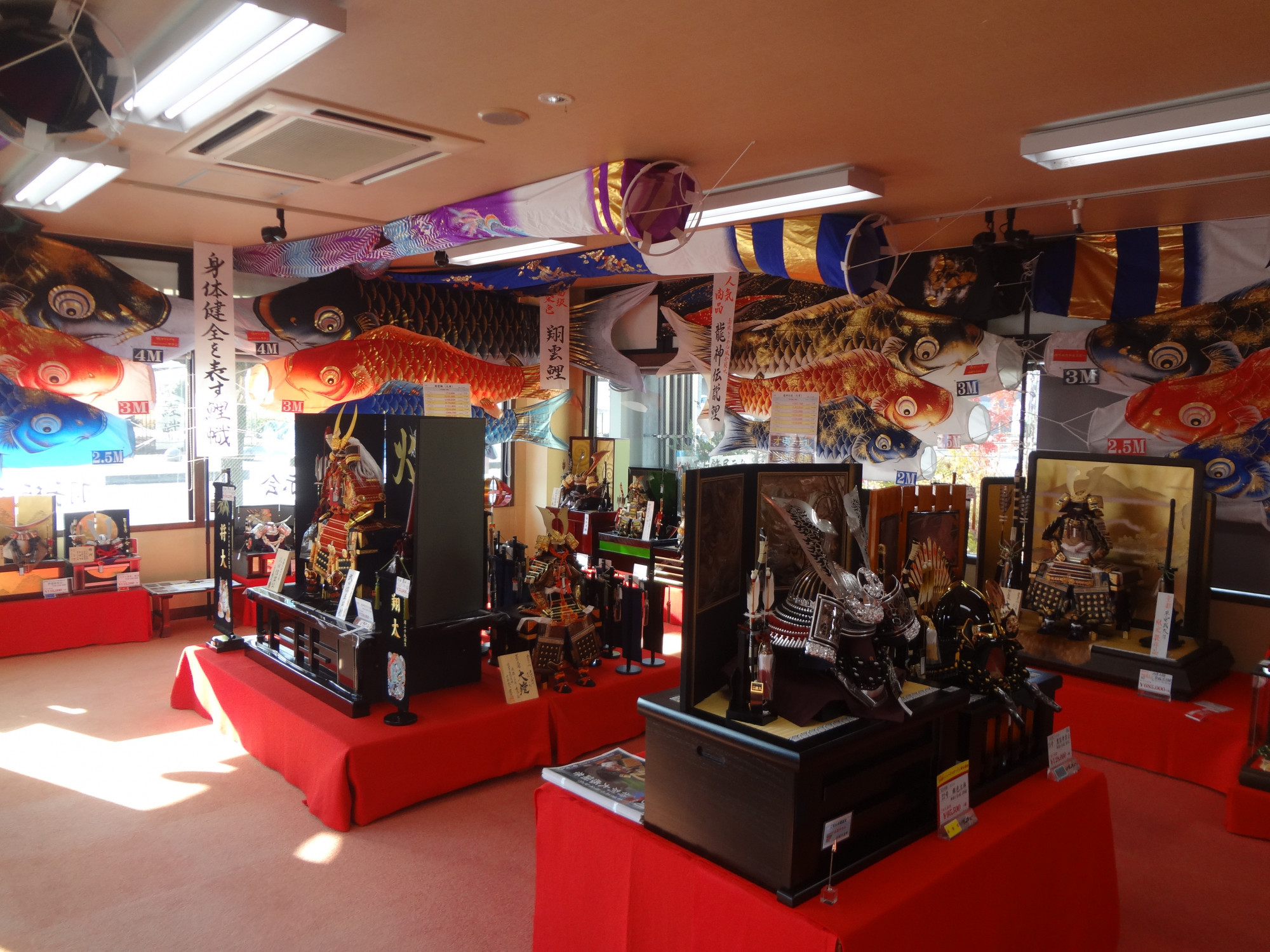 兜や鎧の内飾り、鯉のぼりや武者幟の外飾りなどいち早く展示をしております。気になる値段や疑問など今のうちに解決しておきましょう。1月に入るとゆっくりとご説明できない場合もあるので空いている今の時期がチャンスですよ。