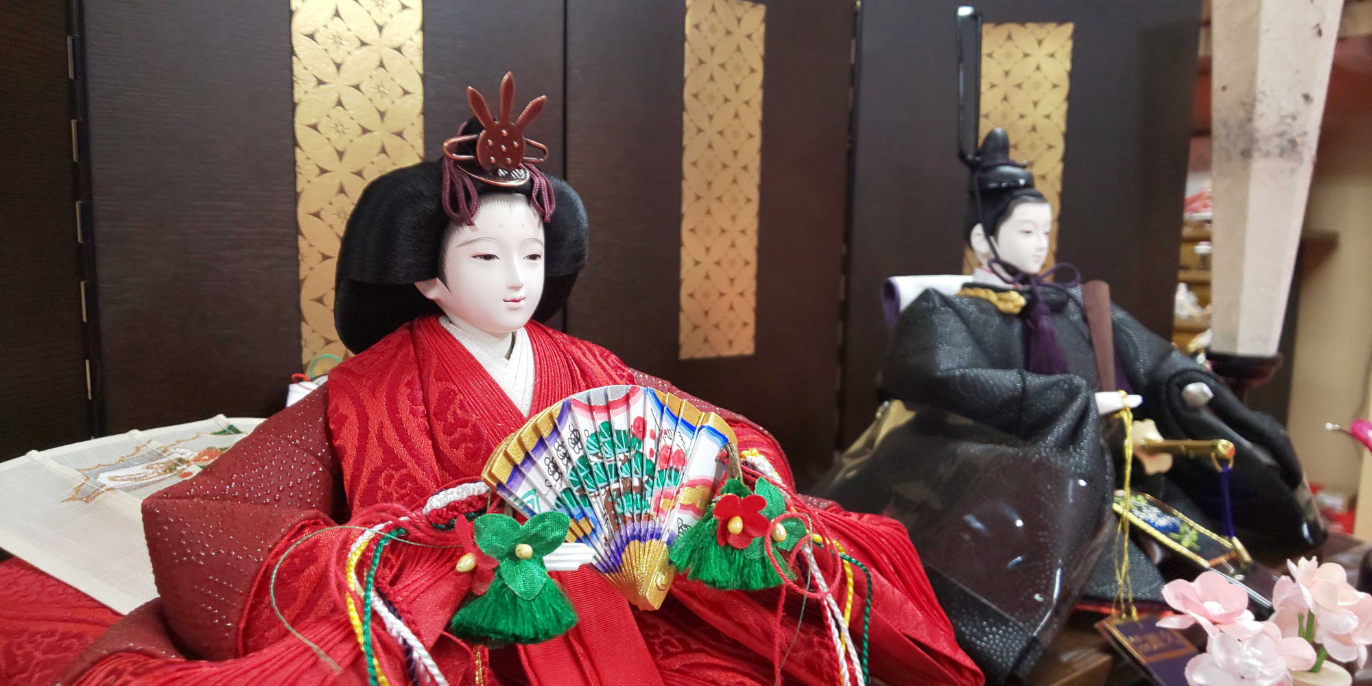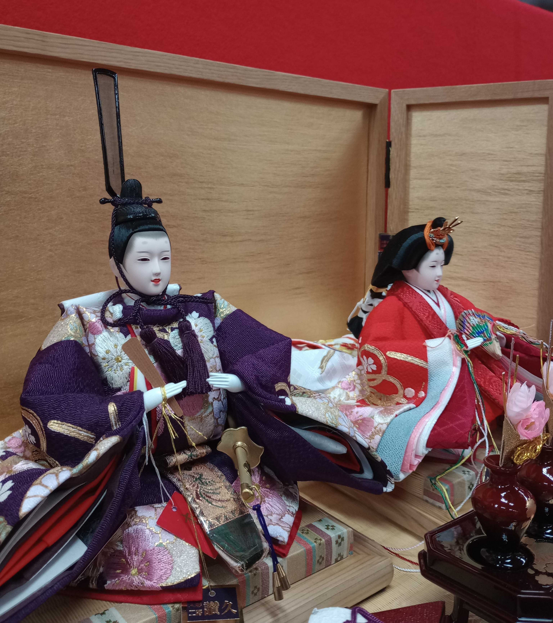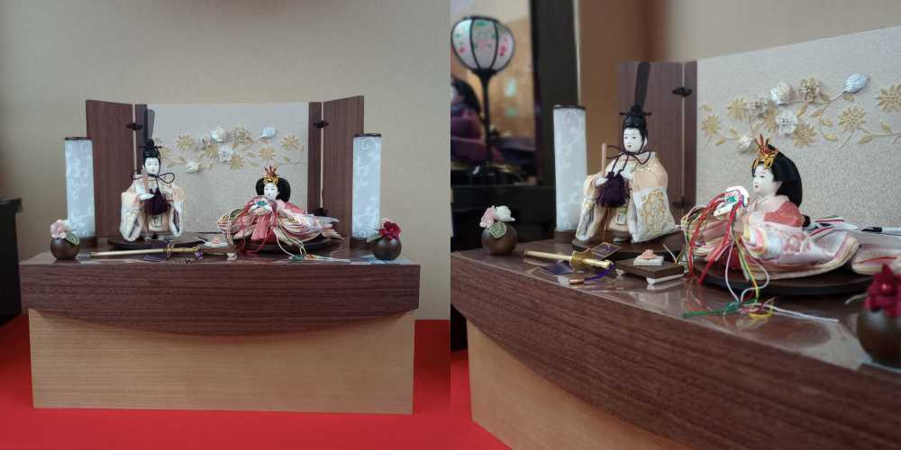 画像ではわかりにくいですが、収納タイプで間口が45㎝という本当にコンパクトなセットもございます。もちろんこのセット以外にもまだまだ小さいサイズのお雛様もございますので、是非ご家族お揃いでご覧になってみて下さい。