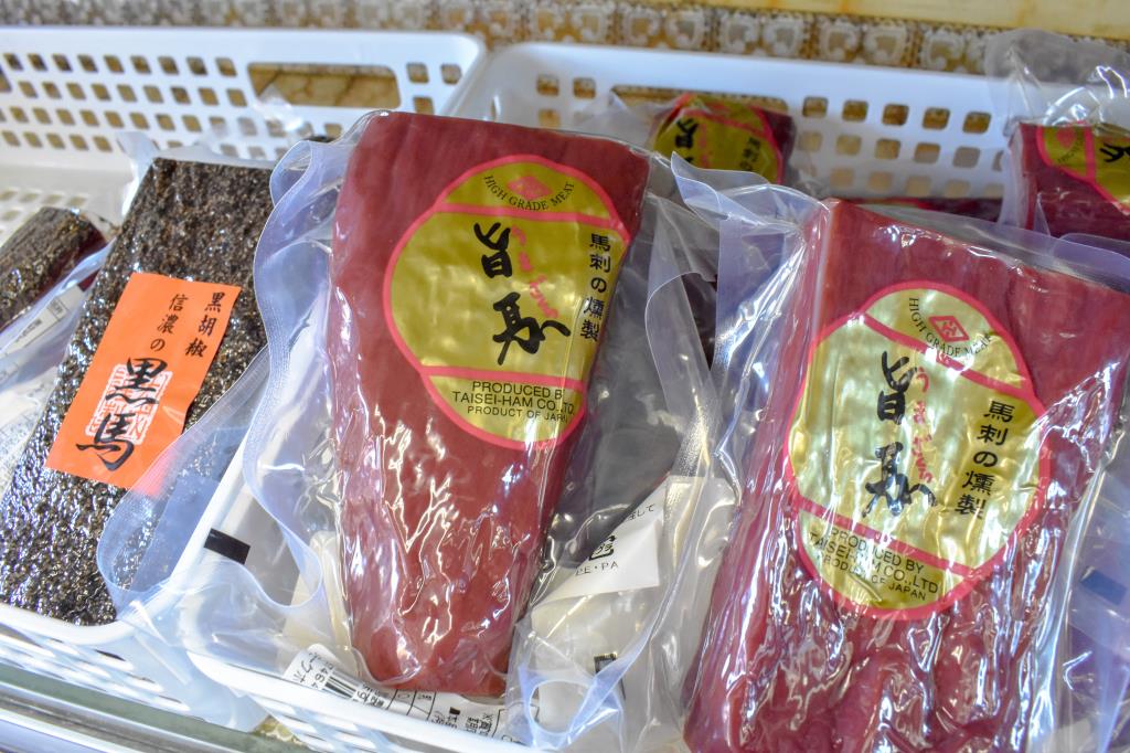 なんとしてもおすすめは、山梨県産の「馬刺し」。地元産の馬刺しは、冷凍ではなく「生」を新鮮な状態で提供するのが最大の魅力。そのクオリティを求めて県内外から購入者が続出!馬刺しジャーキーや薫製など、馬肉製品も多数取り揃えている。