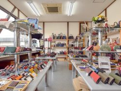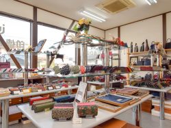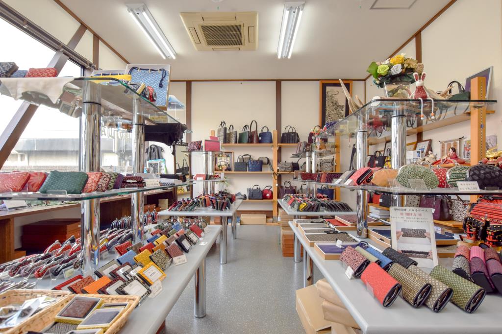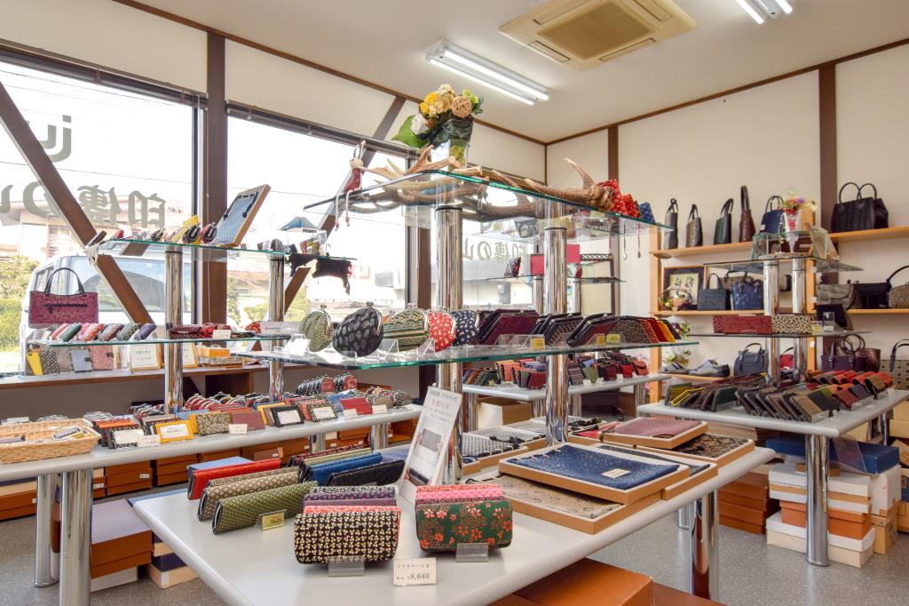 日本で唯一の甲州印伝伝統工芸士(総合部門)が一つひとつ魂を込めて作り上げた製品が並ぶ店内。