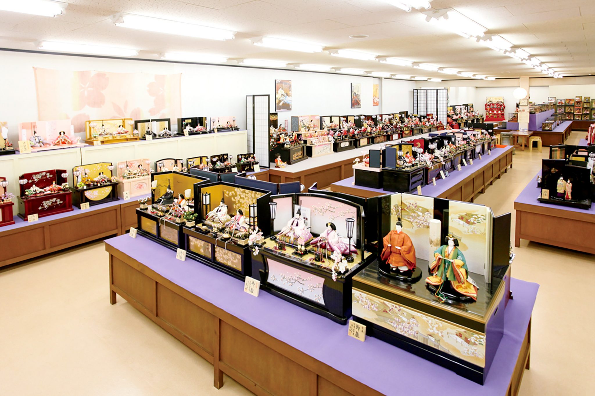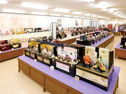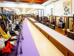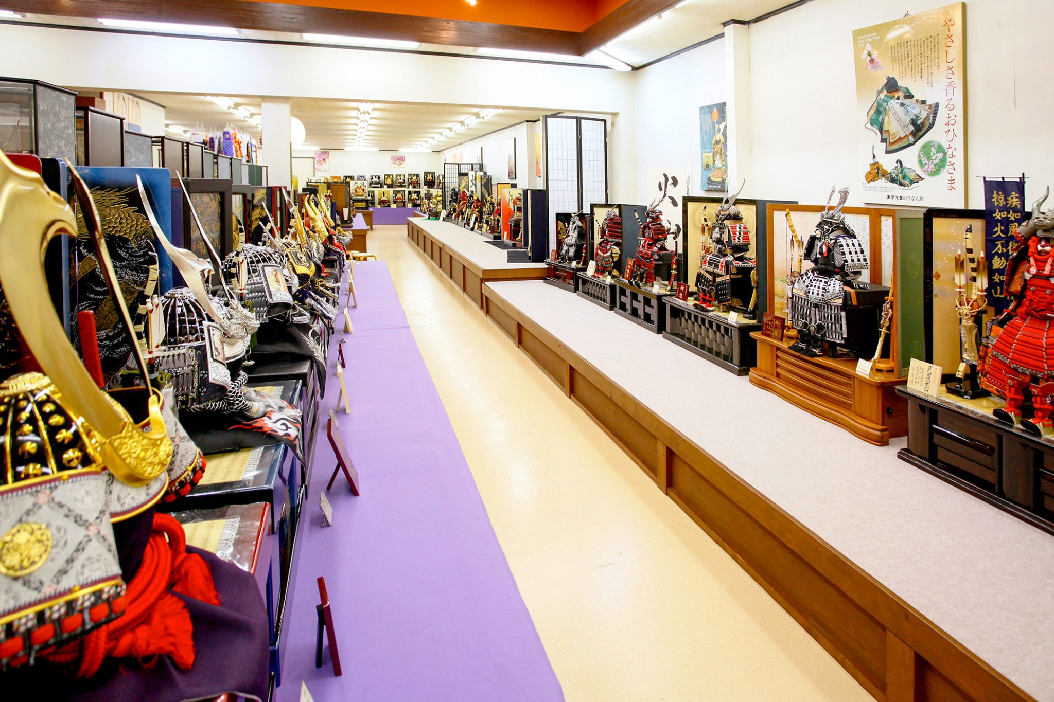 種類豊富な三月人形・五月人形を展示する東京工藝。店内は通路が広くベビーカーでの入店も問題なし◎