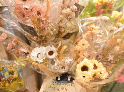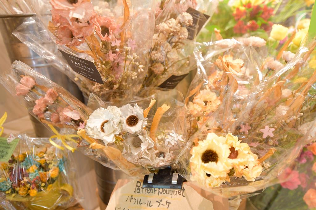 他ドライフラワーのような風合いの造花「パフルールブーケ」も人気の商品。花・プレゼント商品は季節や時期によっても変わる。