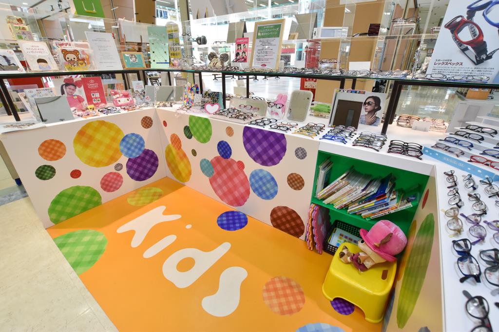 特にキッズメガネは専用のコーナーを設け、小さな子どもでも自分で選びやすいように、子どもの背丈に合わせて陳列。時計(腕・置き・掛け)の取り扱いもしている。信頼できるスタッフが揃っているので初めてでも安心してお店に行ける。