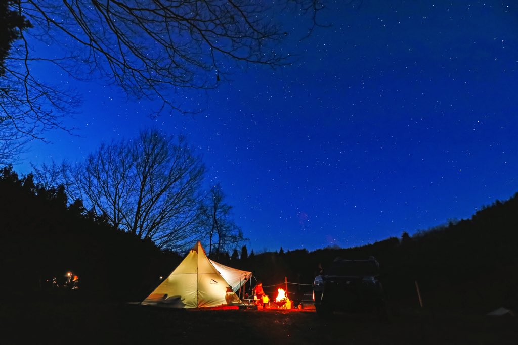 山々に囲まれた豊かな自然の中にある静かなキャンプ場。夜は満点の星空が広がる。
