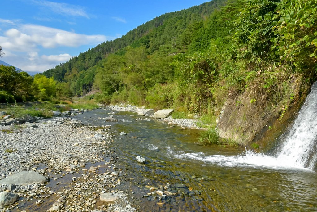 都留市内に流れる鹿留川沿いの自然豊かなフリーキャンプ場。夏の夜にはホタルが観賞できる。