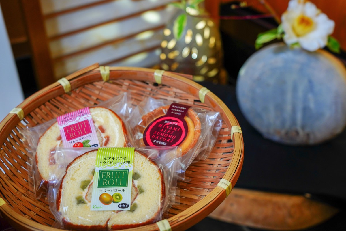 バラエティ豊かな和菓子が揃う中、特に推したい商品は地元、南アルプス市産のすももとキウイを使用した「フルーツロール(すもも・キウイ)」と「すもも便り」。県産の卵を使用した口溶けのよい生地に、キウイピューレ、すももピューレ入りの「フルーツロール」と、チーズタルトに、すもも果肉が相性抜群な「すもも便り」は、どちらもフルーツそのものの旨味を活かして作られ、南アルプスの美味しさがたっぷり堪能できちゃう!自分用にも、お土産にもぴったり◎。