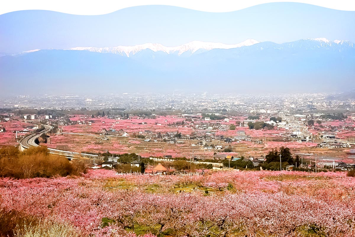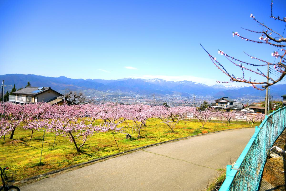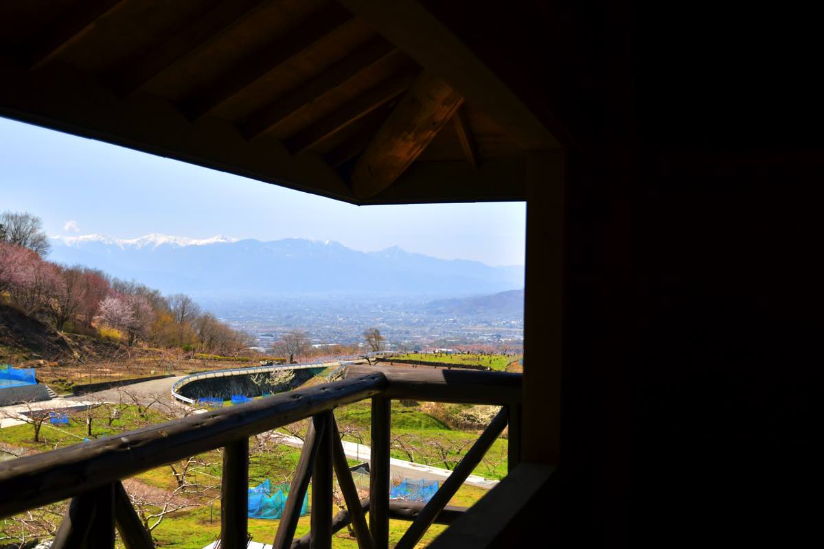 標高約600mに位置する花見台は、桃畑越しに富士山や残雪の南アルプスなど抜群の眺望が楽しめる知る人ぞ知る絶景スポット。