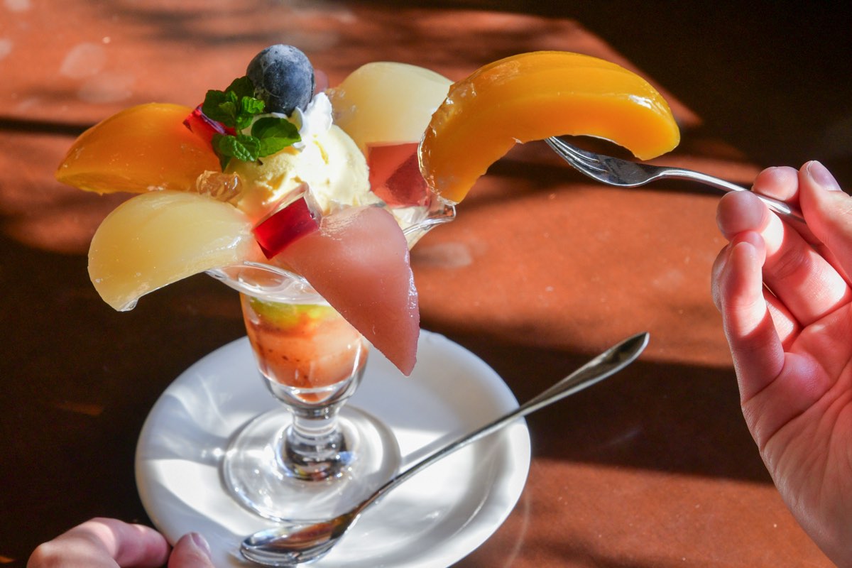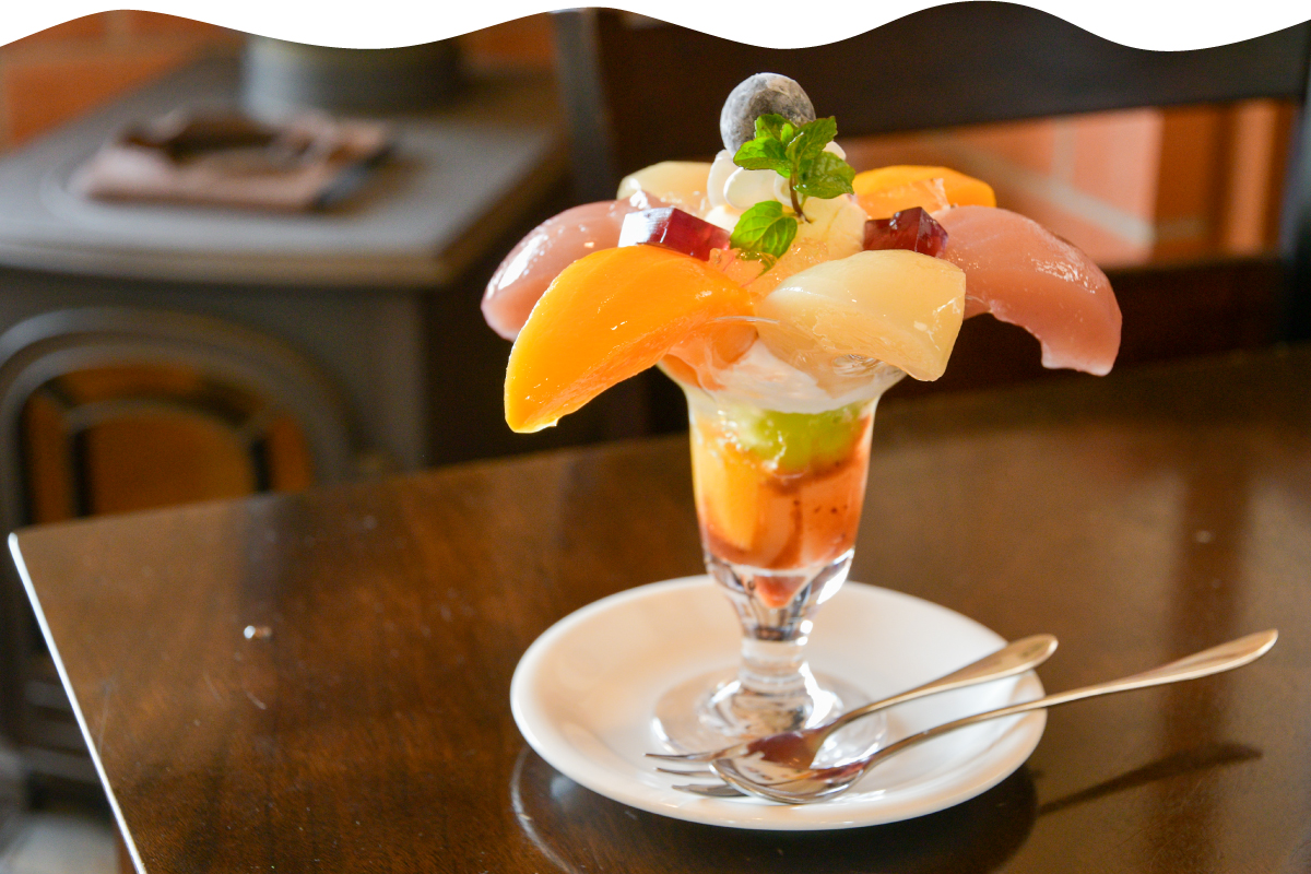 大胆にカットしたコンポートの桃を豪華に3種あしらった、定番の「3種のももパフェ」。自家農園で栽培した「すもも」のソースや、山梨を代表する果物「シャインマスカット」などを忍ばせ、様々な果物をこのパフェ1つで堪能できる産地ならではの逸品だ。