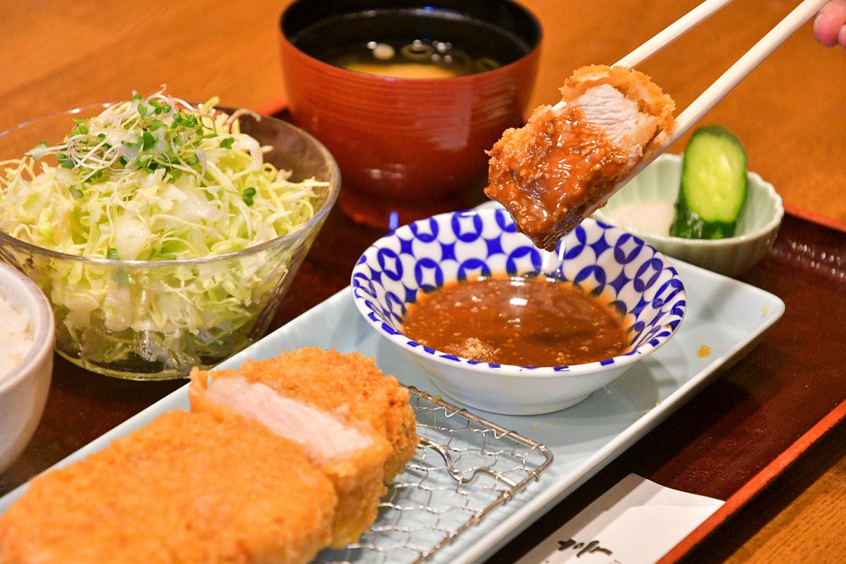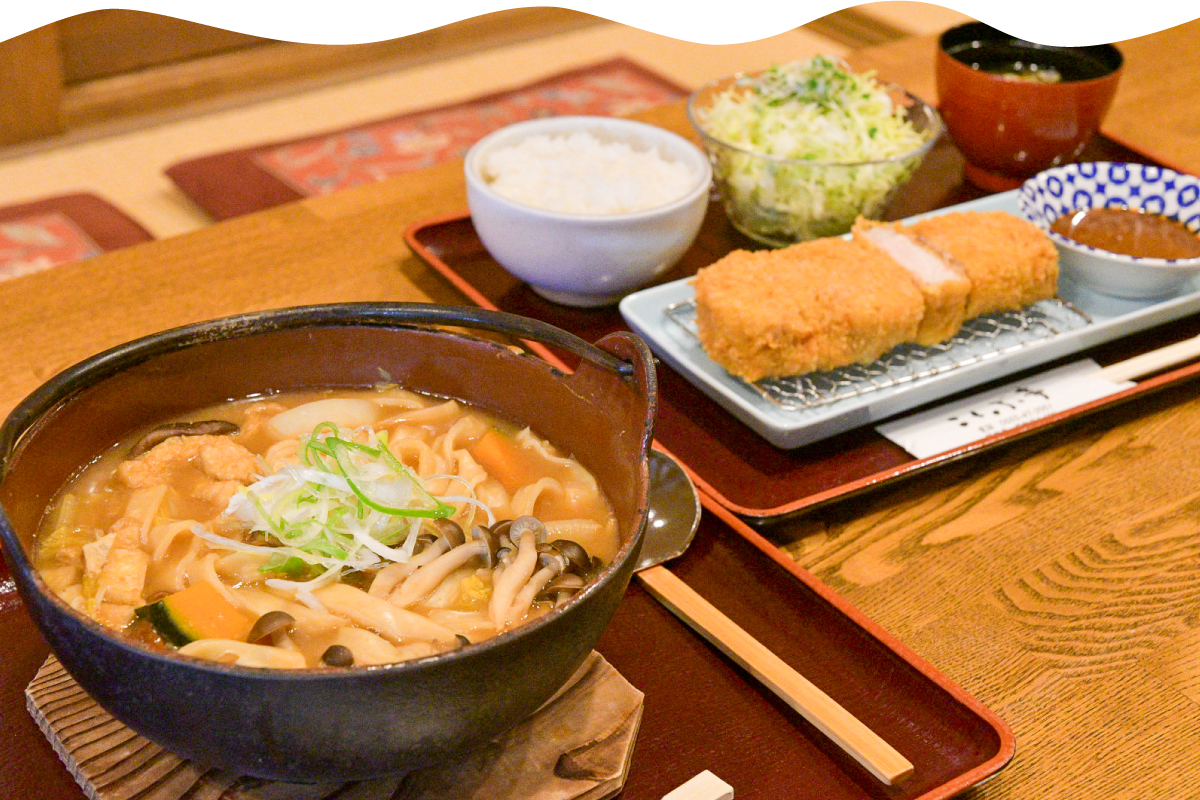 2種のほうとうはそれぞれ味付けが異なり、昔ながらのほうとうに辛みの効いた肉入り「おやじほうとう」と、昔ながらの優しい味つけ「おふくろほうとう」。キャッチーなネーミングだけでなく、その味わいにも職人の技が光る。かぼちゃやにんじんなど、野菜の荷崩れが起きないように計算し尽くし、豊かな食感を実現した逸品だ。さらに、お店イチオシである甲州乳酸菌豚「クリスタルポーク」を使用した「やわらかロースかつ定食」は肉厚ジューシーなカツにリピーター続出。すりごま味噌をつけていただくのも乙なものだ。