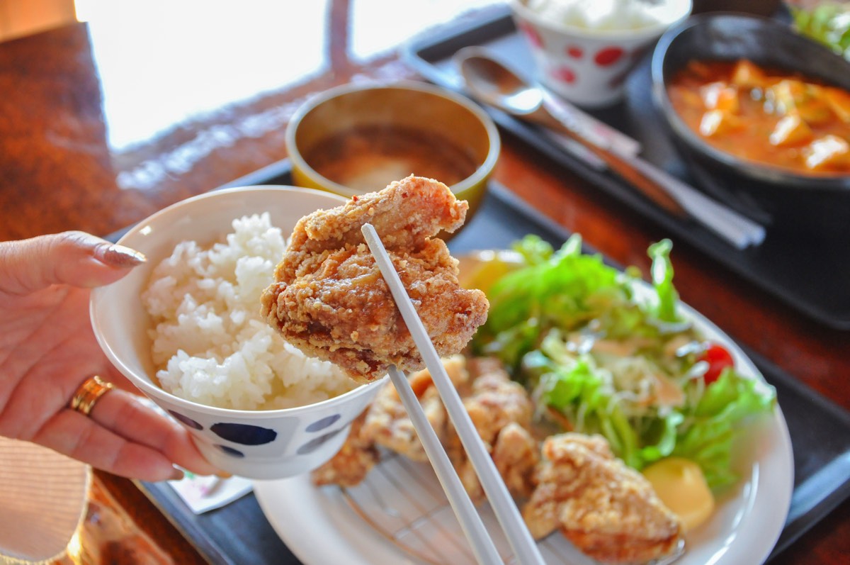 美味しい定食がバラエティ豊かにラインナップする中でも一番人気の唐揚げ定食は、老若男女問わず、多くの胃袋をわしづかみ!大ぶりの国産鶏もも肉にニンニク、生姜、白だしなどでしっかりした味をつけ、カラリと揚げる。