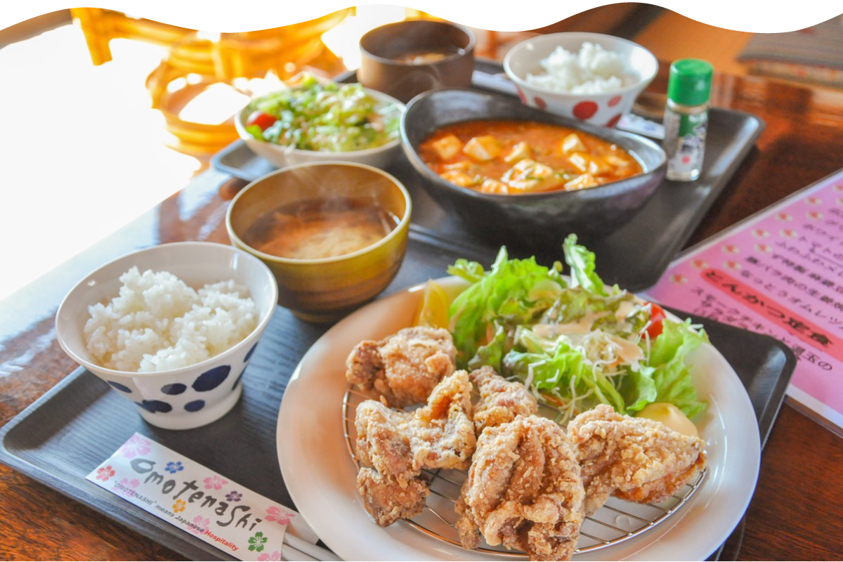 ボリューム満点の定食が種類豊富に揃い、リーズナブルに味わえることで大評判。靴を脱いで上がると、古民家ならではの温かみのある空間が広がる。木の風合いやお座敷や縁側などが醸し出すアットホームな雰囲気の中で、ほっとひと息つける。