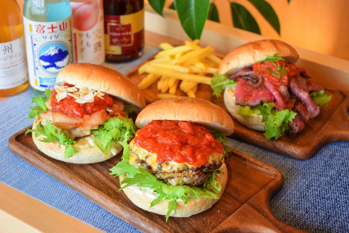 甲州ワインビーフ100%のダイナミックなWチーズバーガーや信玄鶏のガーリックトマトバーガーなど、約10種類が揃うハンバーガーは、魅力的なラインナップでお目見えする。