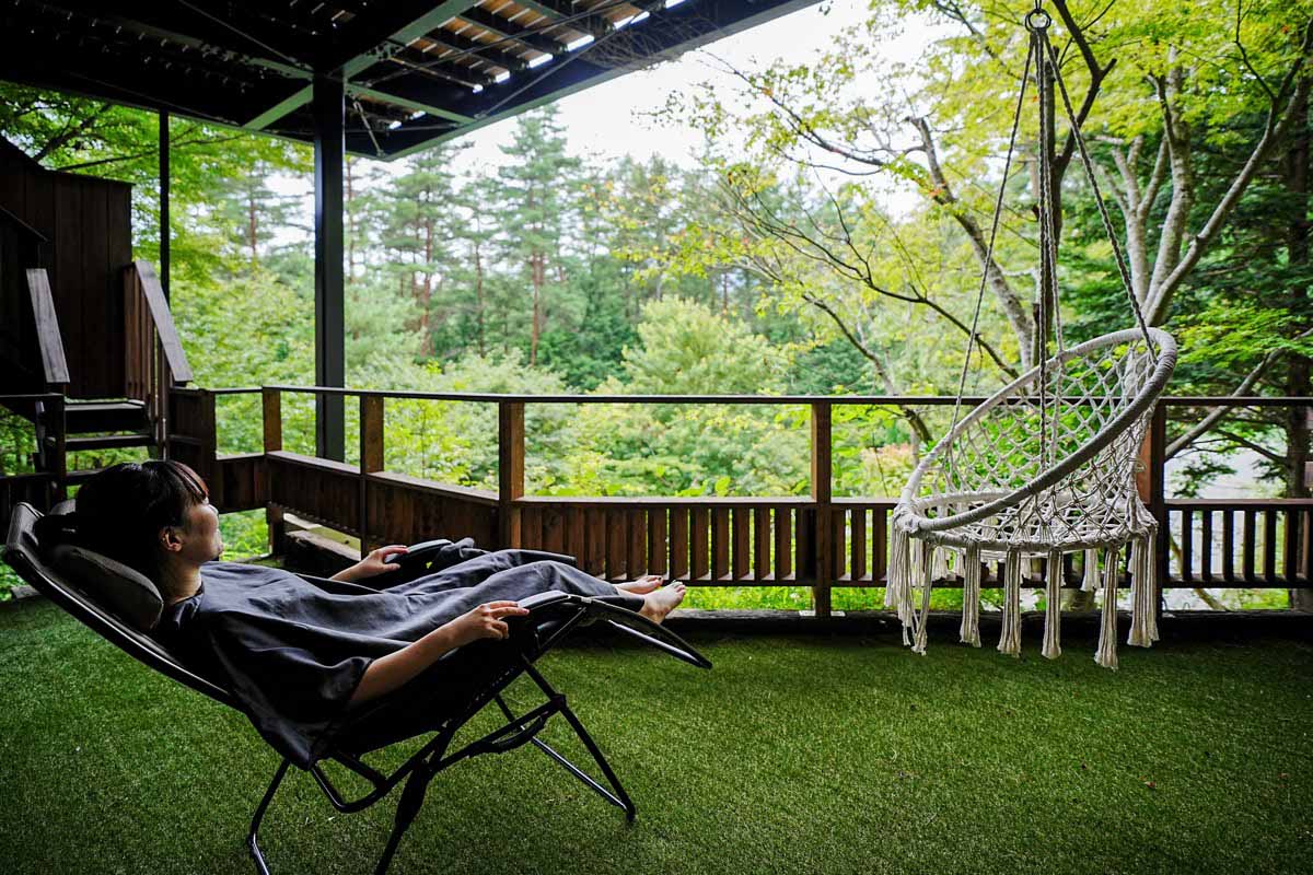 サウナで整ったあとは、共同スペースでひとやすみ。本来ならここから富士山が見えるとの事だが、取材日はあいにくの曇りで出会えず…。富士山は見えなくても自然の心地よい風を感じて、心も身体もさらにととのう。