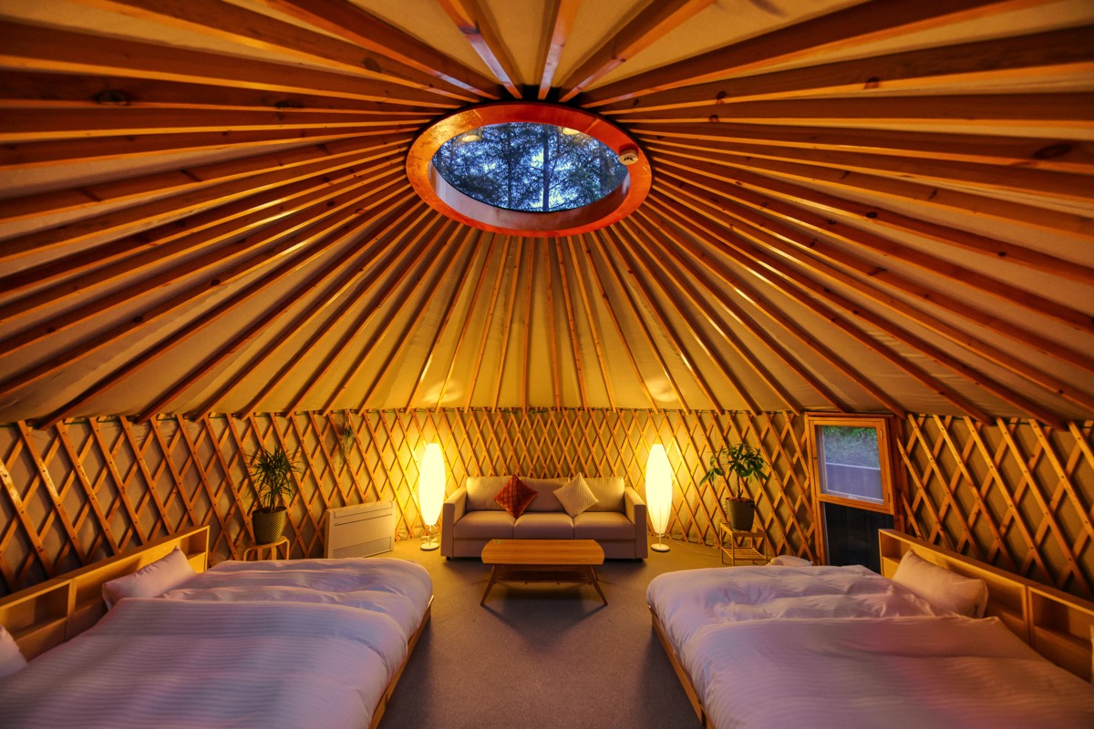 こちらの施設では、絶景の富士山を堪能できるグランピングテントが登場する。7mという広さでゆったりと過ごせる。天井の丸い窓からは光が差し、木々たちと空が顔を覗かせる。夜には星を見ることも◎。