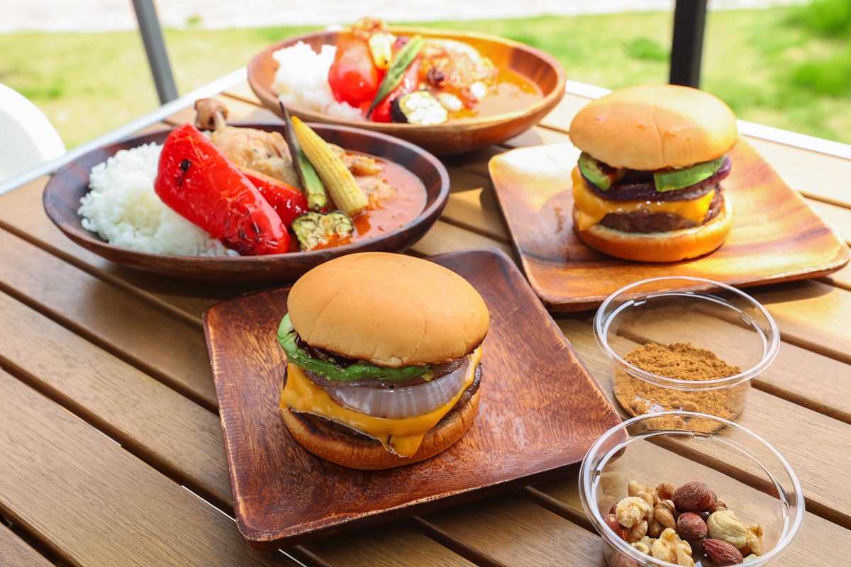 グランピングに欠かせないBBQを、アウトドアをこよなく愛するスタッフが食材を厳選し、遊び心をプラスしてアレンジした、カレー&ハンバーガー!