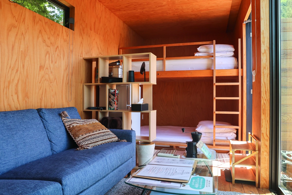 一方、学生やアウトドア初心者に人気なのが、こちらのテントタイプ。自然と対話しながら、アウトドアならではの不便を楽しむ要素も。シャワーやトイレは施設内の供用トイレを使用するが、冷蔵庫やベッドなどは完備されているので、快適さと自然体験のいいバランスを味わえそう。