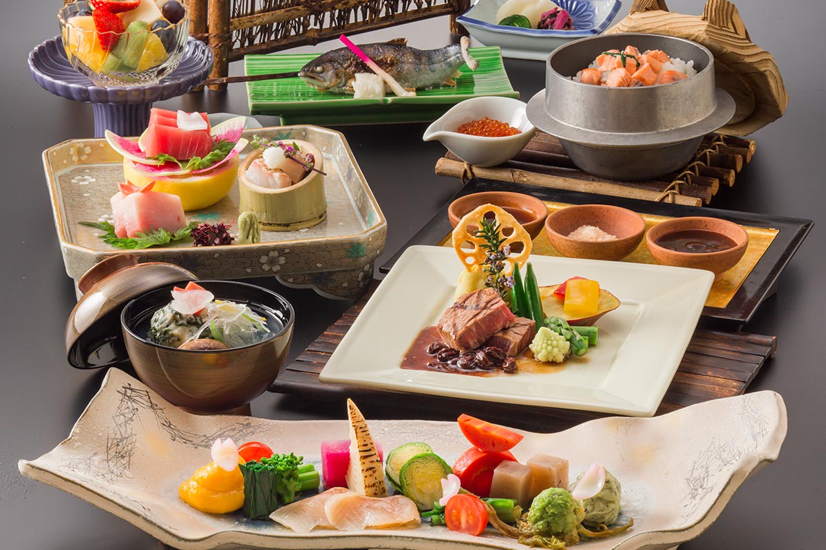 バイキングレストラン「山のかまど」にて、山梨の旬な食材にこだわった料理を楽しめる人気のプラン。オープンキッチンでは、ホテル料理人が目の前で出来立てのお料理を提供してくれる。老若男女、お子様から大人まで旅のぐるめにワクワクしちゃう!