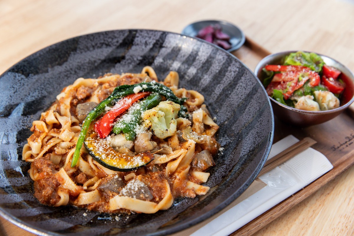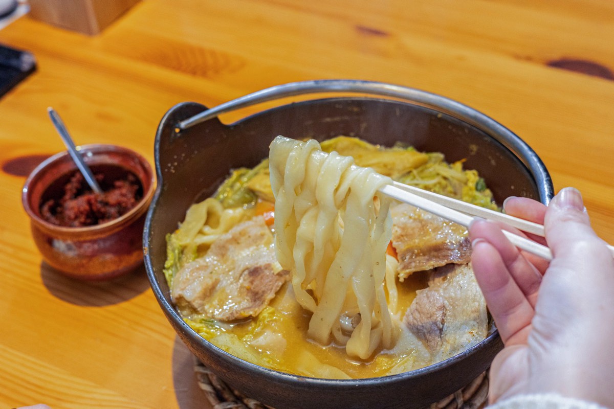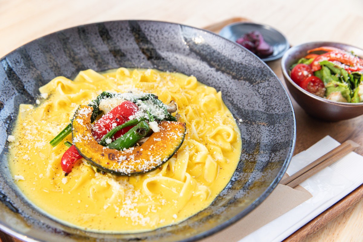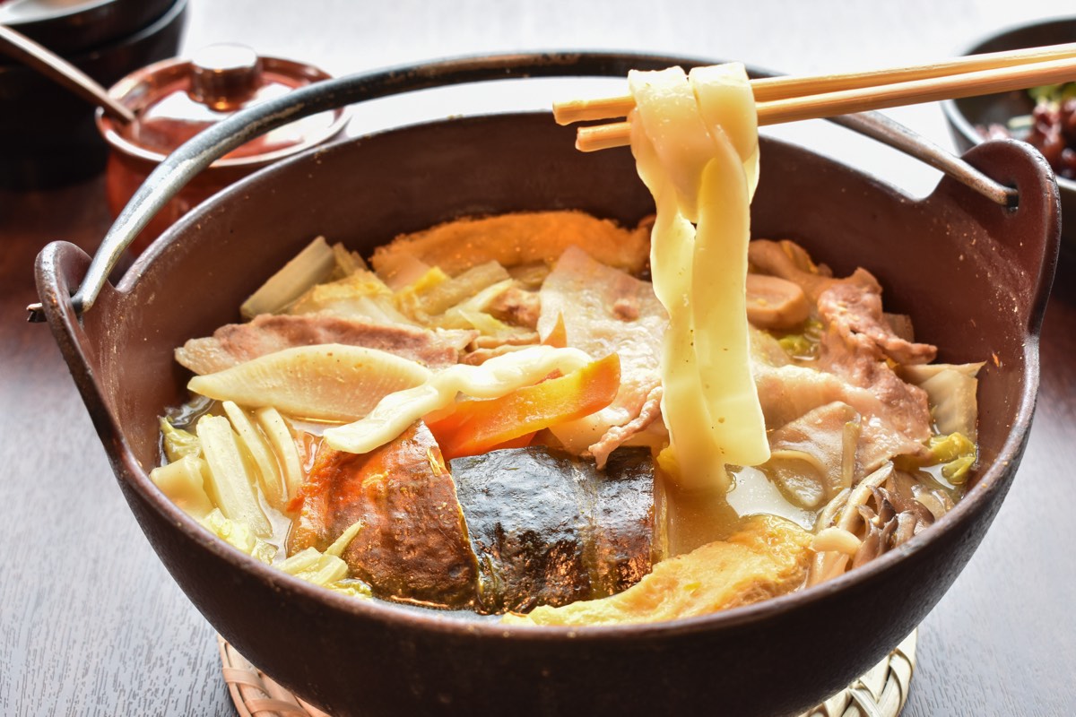 看板メニューの黄金ほうとうは、かぼちゃペーストを加えた秘伝味噌とあわびの肝ペースト、京都の無添加だしが決め手の逸品。