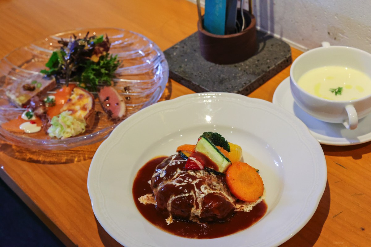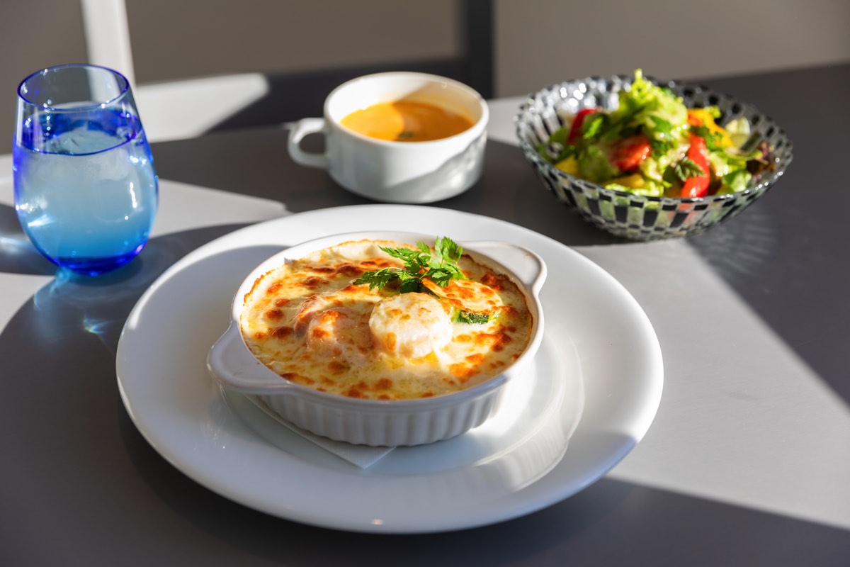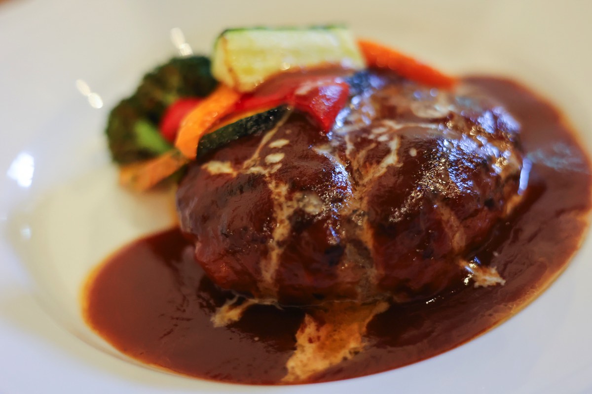 イチから手作りしたフレンチ仕込みのデミグラスソースに絡め、スパイスを駆使した肉汁溢れる豚肉100%のハンバーグを頬張る幸せ!また、大ぶりのシーフードがゴロゴロ入ったシーフードグラタンも、自家製ベシャメルソースと魚介の旨味が華麗なるハーモニーを奏でる。地元民も通う人気店というのも納得だ。