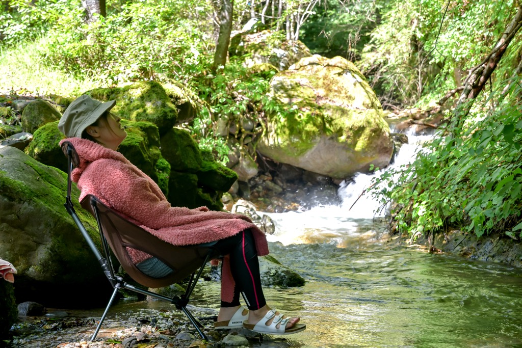 身体が芯まで温まったら、すぐそばの沢へダ~イブ!これが、くろべら流!全身を一気にクールダウン。大自然に身をまかせ、思い思いに過ごす贅沢な時間のはじまりだ。