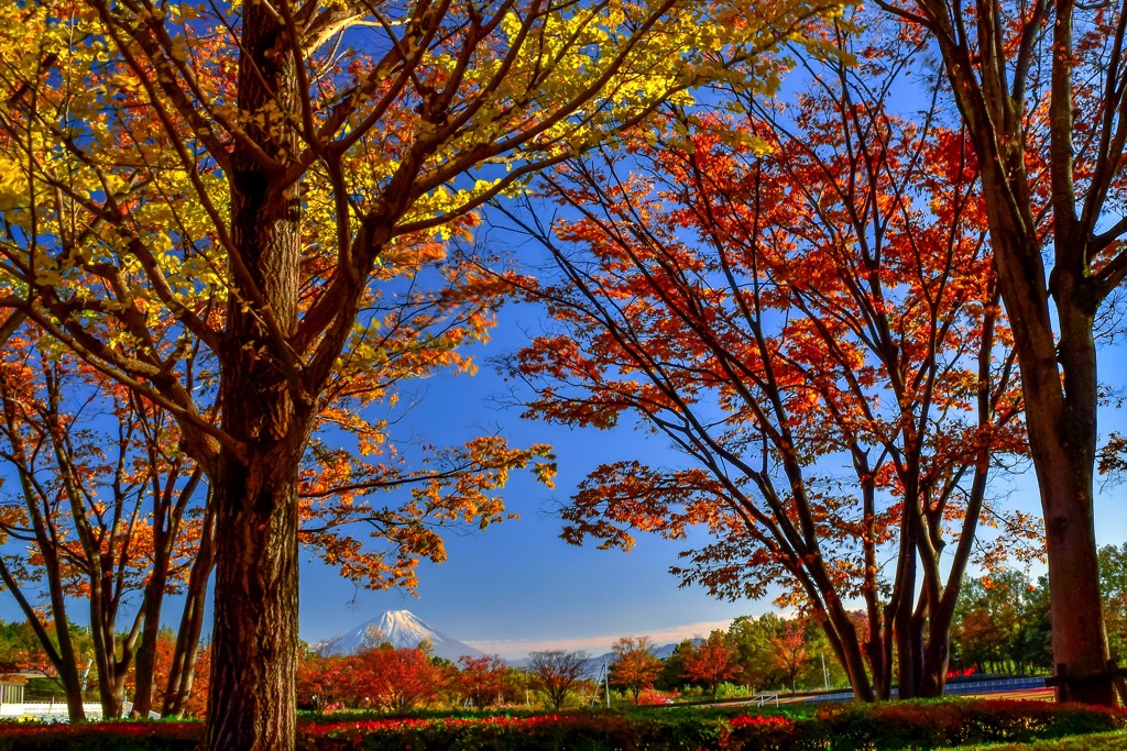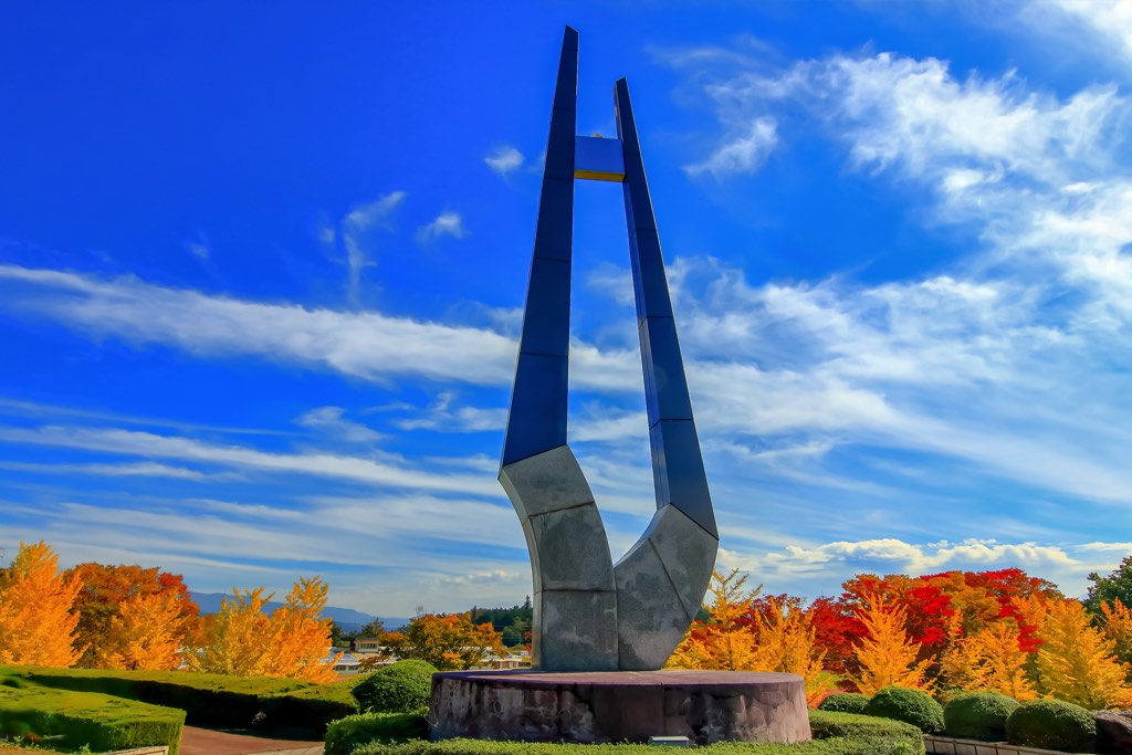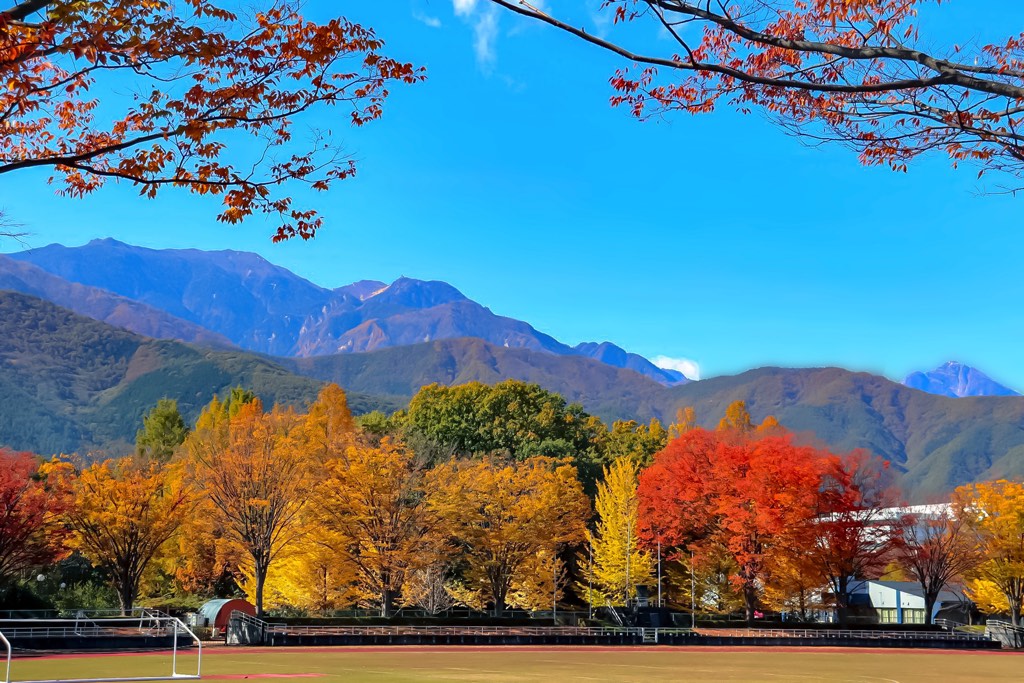 韮崎中央公園といえば、園内に蒸気機関車や電気機関車、巨大カブトムシのオブジェがあることや、春から秋にかけてはミニSLも運行していることで、子どもの絶好の遊び場として大人気。園内遊歩道の敷地が広く散歩コースとして利用する人も多く、老若男女に愛されている。中でも、黄金色に美しく染まったイチョウ並木が10月下旬から見頃を迎え、秋一色に染まる。休日は家族でテイクアウトをしてピクニックをしながら過ごしてみては。