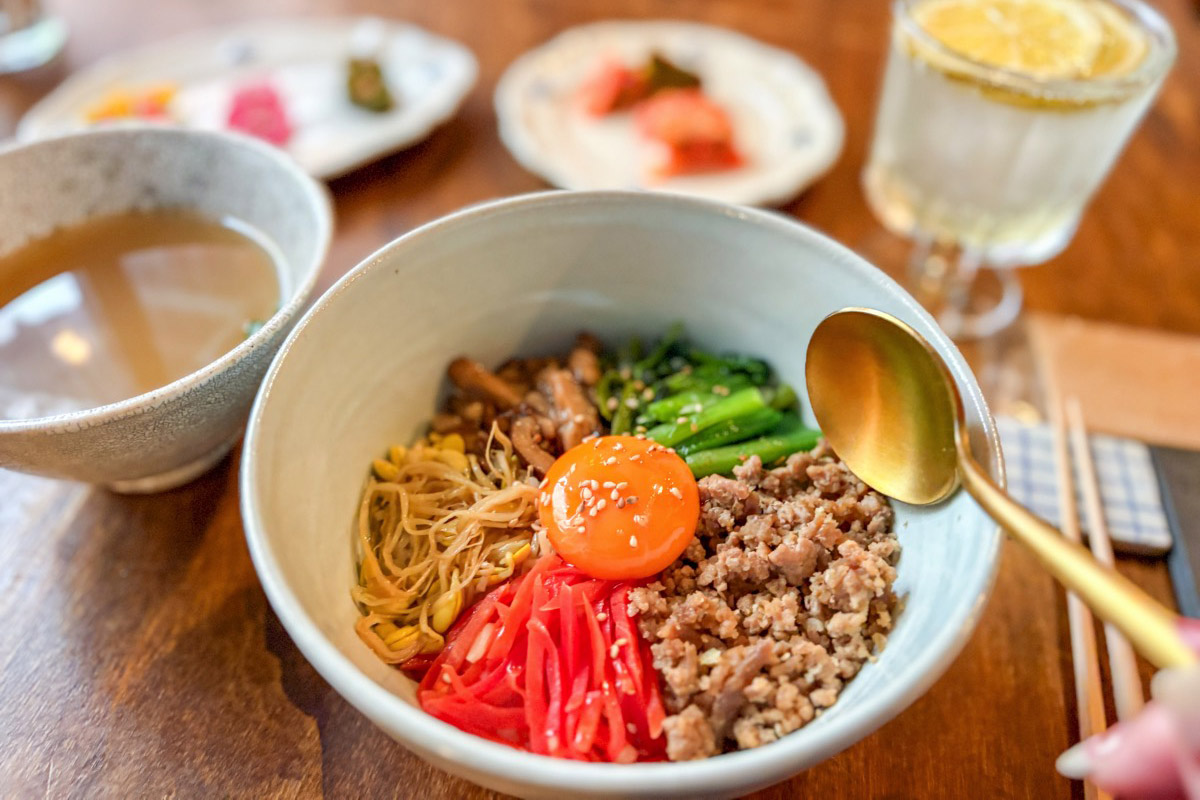 ほうれん草やニンジン、豆もやし、豚挽肉、しいたけなど野菜たっぷりのビビンパは、大人気のメイン。ごま油をまぶしたご飯に、野菜にも下味が付いているので、そのままでもあっさりと食べられる。辛みはお好みで後入れも。レモン・桑の実・スモモ・ジンジャーなど5種類が揃う自家製フルーツシロップジュース もおすすめ。