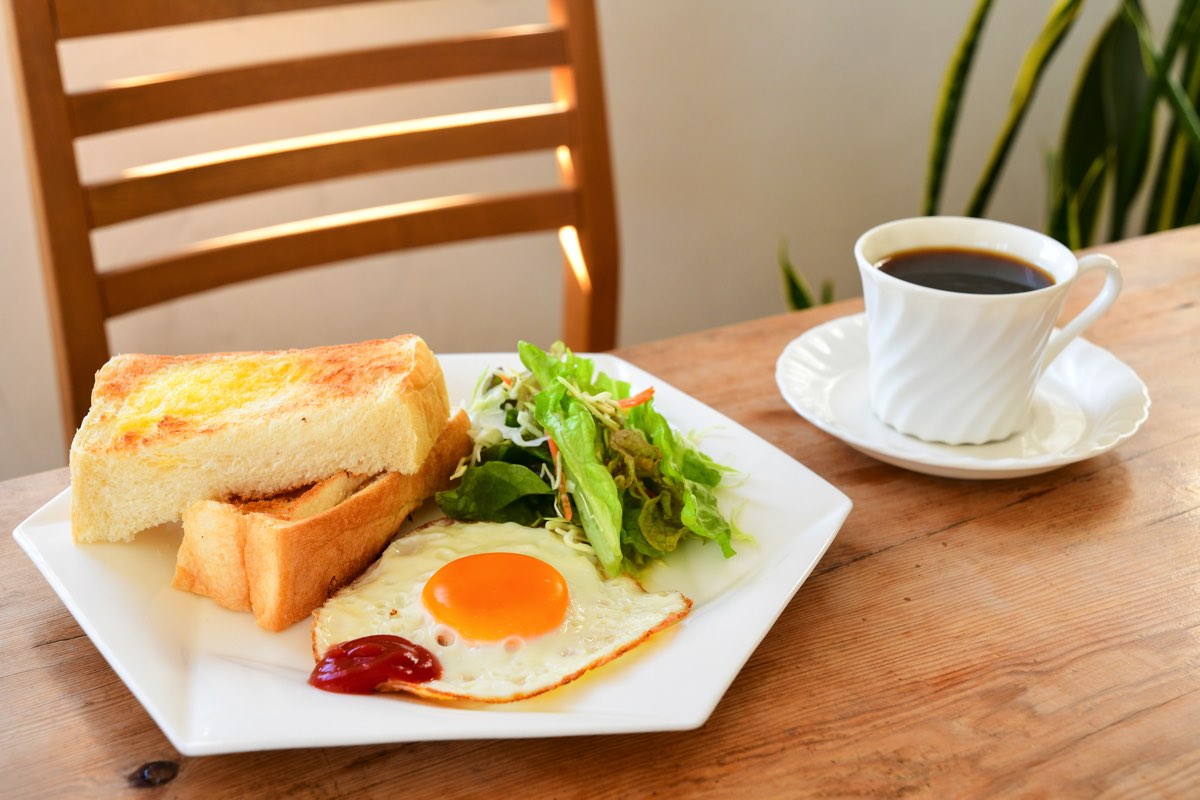 こんがりと焼き上げられた厚切りトーストは、外はカリッと、中はふんわり!食べた瞬間、バターがジュワっと口に広がる。サラダには、ハーブやガーリックを入れた手作りのドレッシングを使用し、フレッシュな野菜と相性抜群だ。程よく半熟の目玉焼きは、トーストに乗せて食べるのも◎。