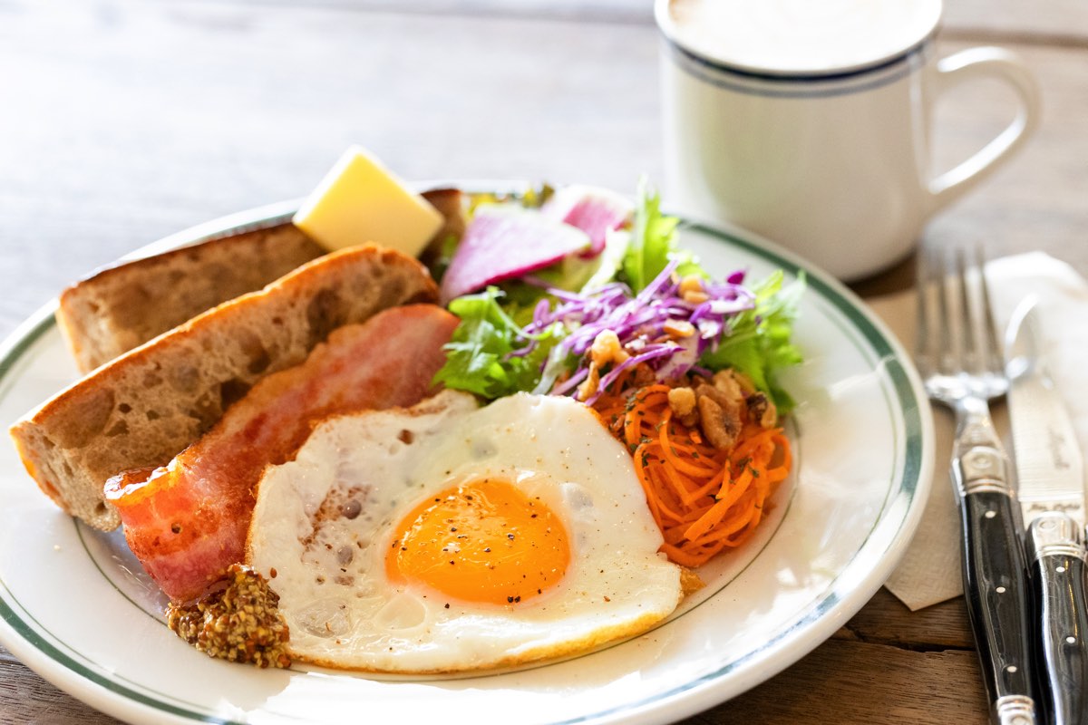 8時から10時の間に楽しめるモーニングメニューの中でも、イチオシがこちら。ベーコン・目玉焼き・サラダ・パン&バターという定番の朝食は、観光客からビジネスマン、朝活層まで幅広く人気を集めている。彩りも美しく、ビジュアルから食欲をそそる。