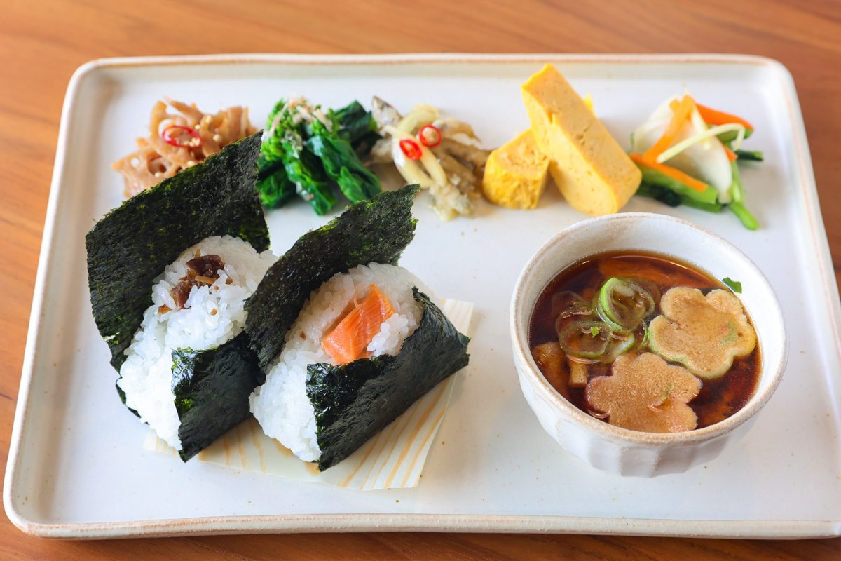 さっと食べられるおにぎりは、日本の朝ごはんの代表格。店内限定で味わえるおむすびセットBセットは栄養バランスも秀逸だ。9種類の中から好きなおむすび2個を選べ、味噌汁とだし巻きたまごに加え、4種類もの手作りおばんざいが付き、とっても豪華!