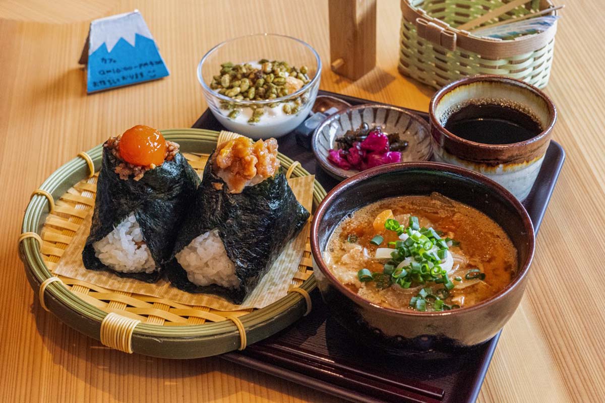 「おにぎりってこんなに美味しかった??」…そう思わせてくれる瞬間が、富士茶庵の朝食。7時から9時半までのオーダーに限り、この絶品おにぎりを味わうことができる。好きなおにぎり2個に豚汁とお新香、信玄餅ヨーグルト、珈琲または黒豆茶がセットに。