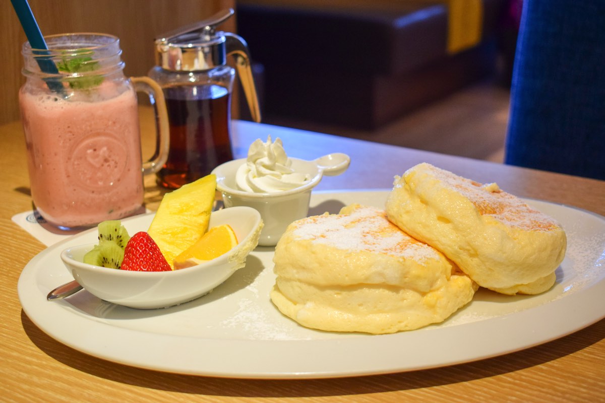 口の中でとろけてしまう、ふわっとろのパンケーキは、注文ごとにメレンゲを立てて生地と合わせ、焼き上げてくれるというこだわりの看板メニュー。リコッタとクリームチーズの軽やかなコクが、上質で贅沢な朝の時間を彩ってくれる。フルーツMIXのパンケーキに、いちごシロップにバナナ2本分を使い、自然な甘みがヨーグルトとミルクに溶け込んだスムージーとセットにしても、1,300円台とリーズナブルなのもポイントだ。