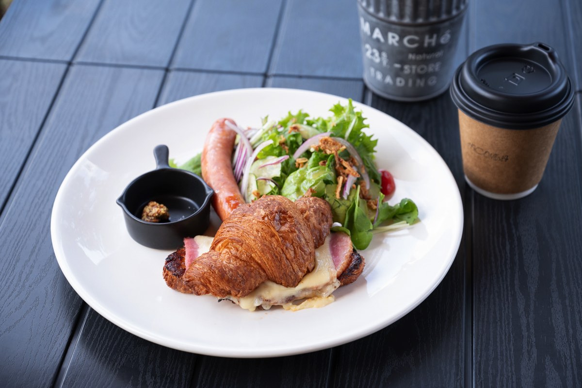 クロワッサンで作ることによってバターの風味をより実感でき、パリっとサックリ食感が楽しめる贅沢なひと品だ。中のベーコンとチーズの程よい塩加減がマッチし、プロの技が光る味わいが堪能できる。地産地消にこだわり、富士山麓の旬の野菜や山中湖プレミアムソーセージなど、新鮮な食材が食べられるのも魅力のひとつ。そのほか、たっぷり野菜やだし巻きたまごなど4種類の具材から選べるサンドウィッチもあり。