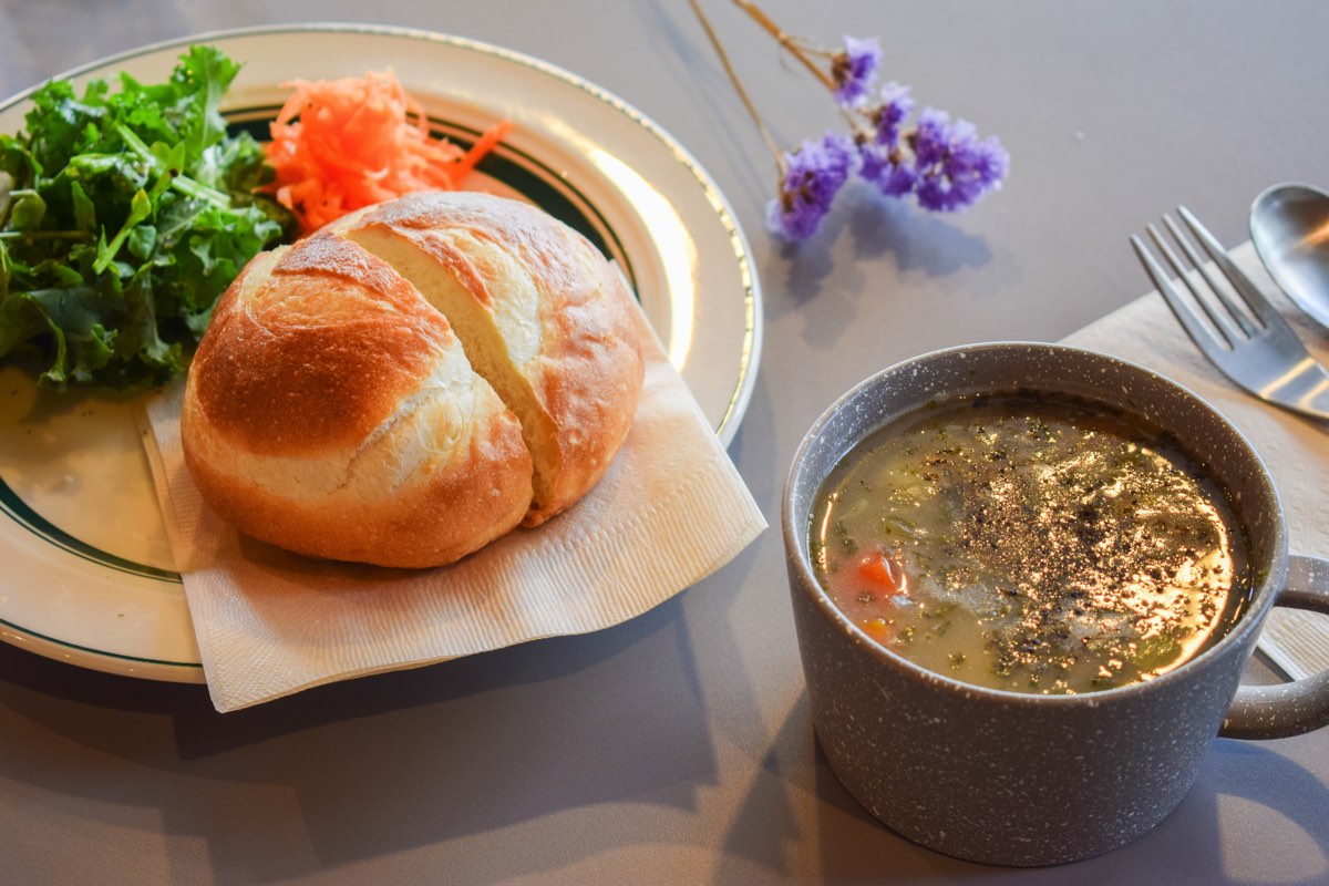 マジョラムというハーブのスパイスの効いた上品な香りが鼻を抜け、きのこや野菜がたっぷり入ったチェコ風のスープ。ごろっと入ったきのことじゃがいも、細かく刻んだにんじんなど栄養満点!バランスよく盛られたサラダとキャロットラペを楽しみながら、パンをスープへディップしていただくのも◎。身も心もほぐしてくれる温かいスープとふわっふわのパンで朝一番から幸せな時間を堪能しよう。