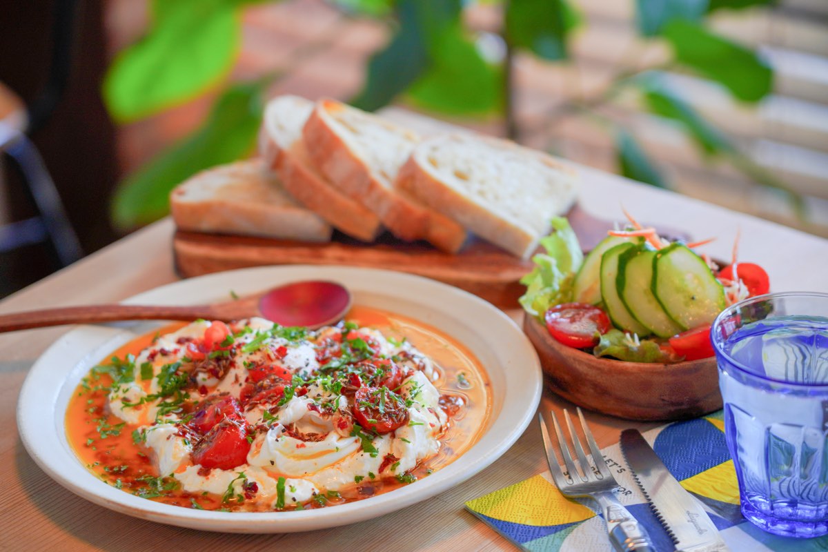 チュルブルはトルコの伝統料理で、ヨーグルトの上にポーチドエッグをのせて、ニンニク香るチリ風味のバターソースをかける。どんな味なの!?と想像しがたいが、自家製ギリシャヨーグルトの酸味と卵のまろやかさが口の中で初めてのハーモニーを爽やかに奏でれば、もうやみつきに。さらにクミンとチリのガーリックバターソースなんて、絶対日本の感覚では思いつかない美味しさだ。アントニーさんが手塩にかけて焼き上げたサワードゥブレッドにたっぷりつけて。