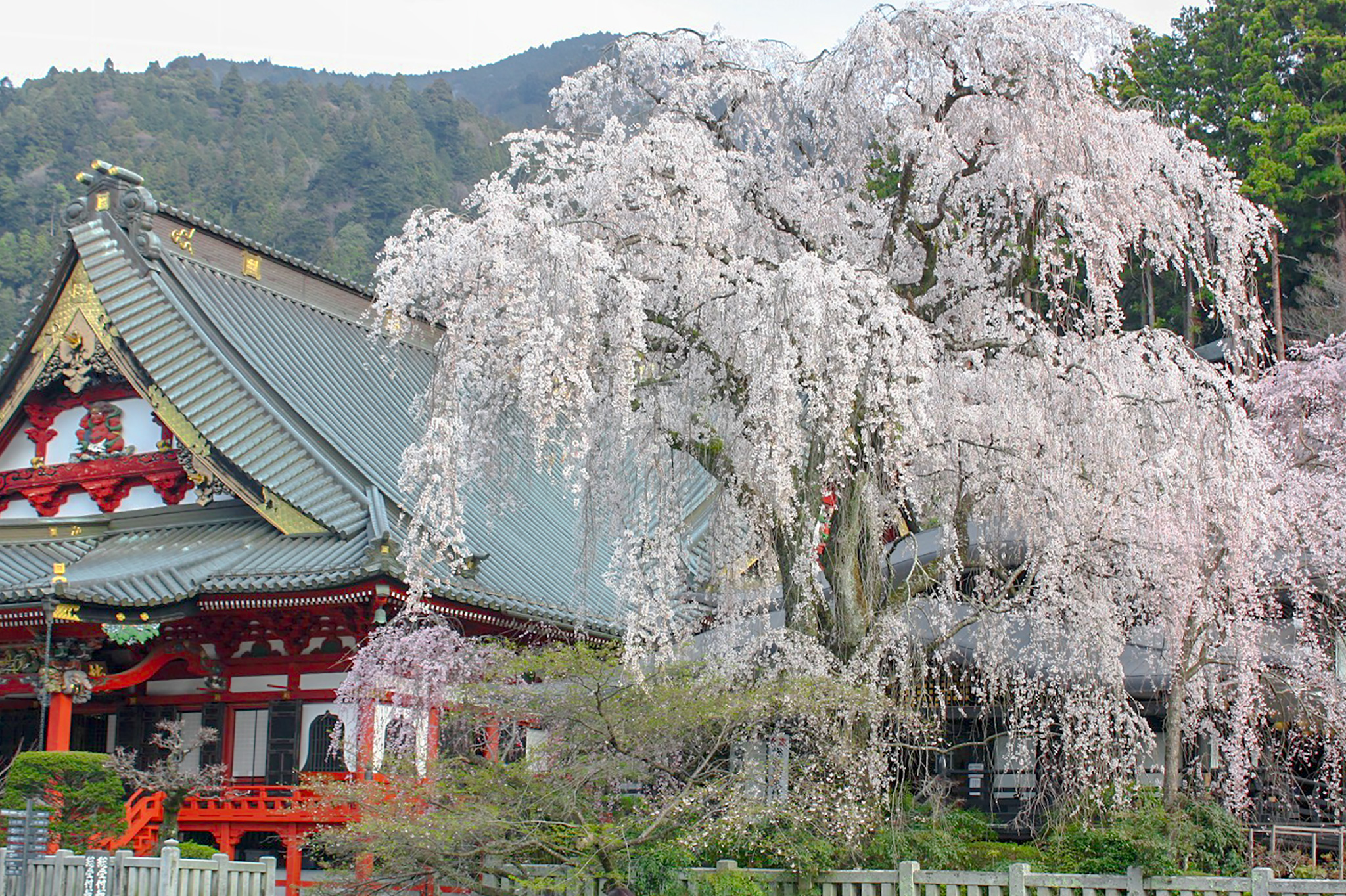身延山久遠寺周辺は、「日本さくら名所100選」にも選定されている桜スポット。境内にそびえる樹齢400年の2本のしだれ桜は全国しだれ桜10選のひとつ。桜色の雫が空から降り注ぐ姿は豪華絢爛。祖師堂や五重塔と桜の饗宴も見事。