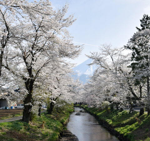 忍野八海近くにある新名庄川。その川沿いに600本近くの桜が咲き誇り、間近に見える富士山との絶景を激写しようと多くのカメラマンが押し寄せる。特に忍草浅間神社付近の「お宮橋」からが定番の撮影ポイントで、撮影の順番待ちが発生するほど。富士山を美しく撮るには順光の午前中がおすすめ。